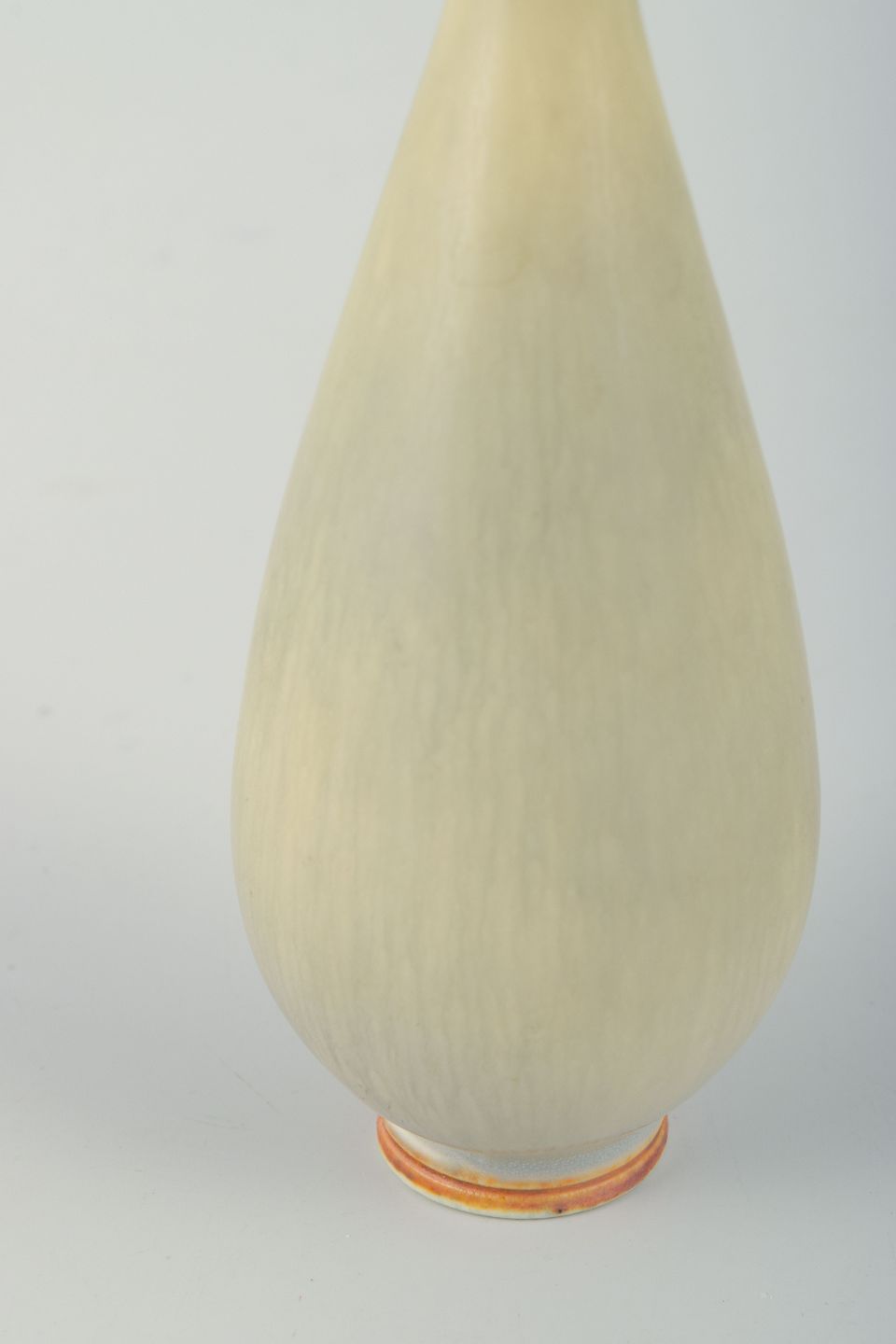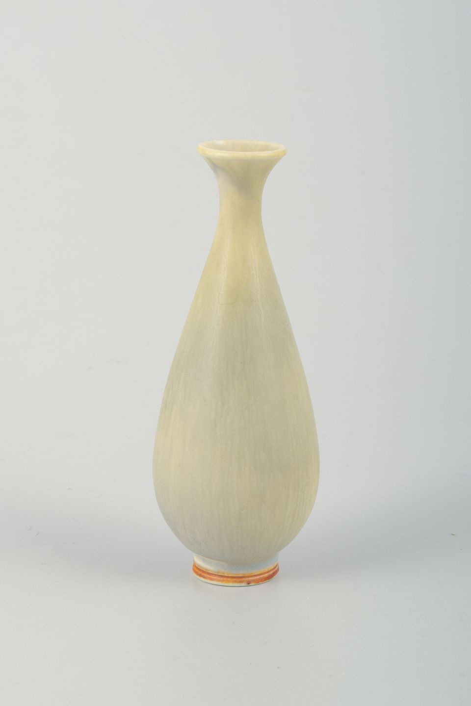 Lille, elegant vase af stentøj, udført som studio hand af Berndt Friberg i hans atelier for Gustavsberg, Sverige, midt i 1900-tallet. Smukt glaseret i lyse, afdæmpede nuancer med fint spil i overfladen. Den slanke, dråbeformede silhuet afspejler Fribergs særlige sans for proportioner og enkelhed.