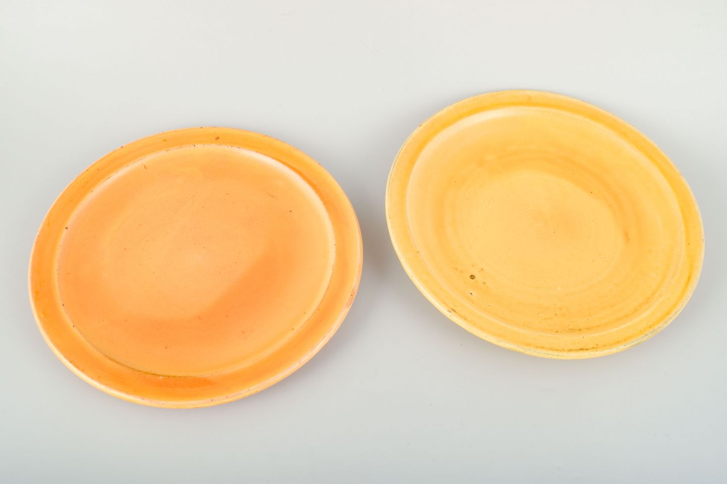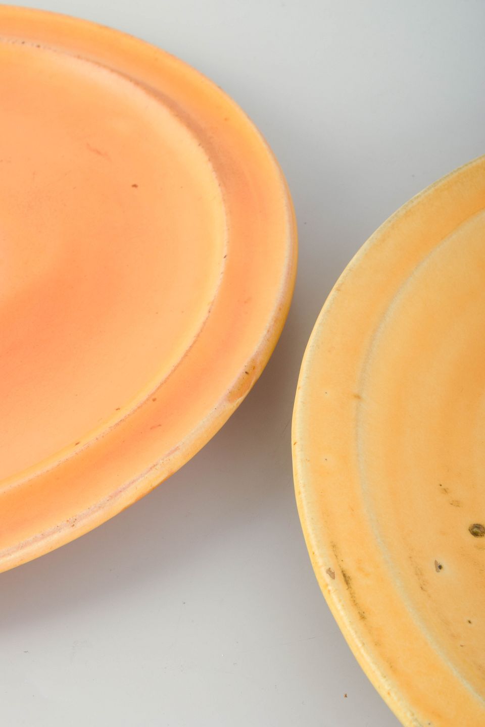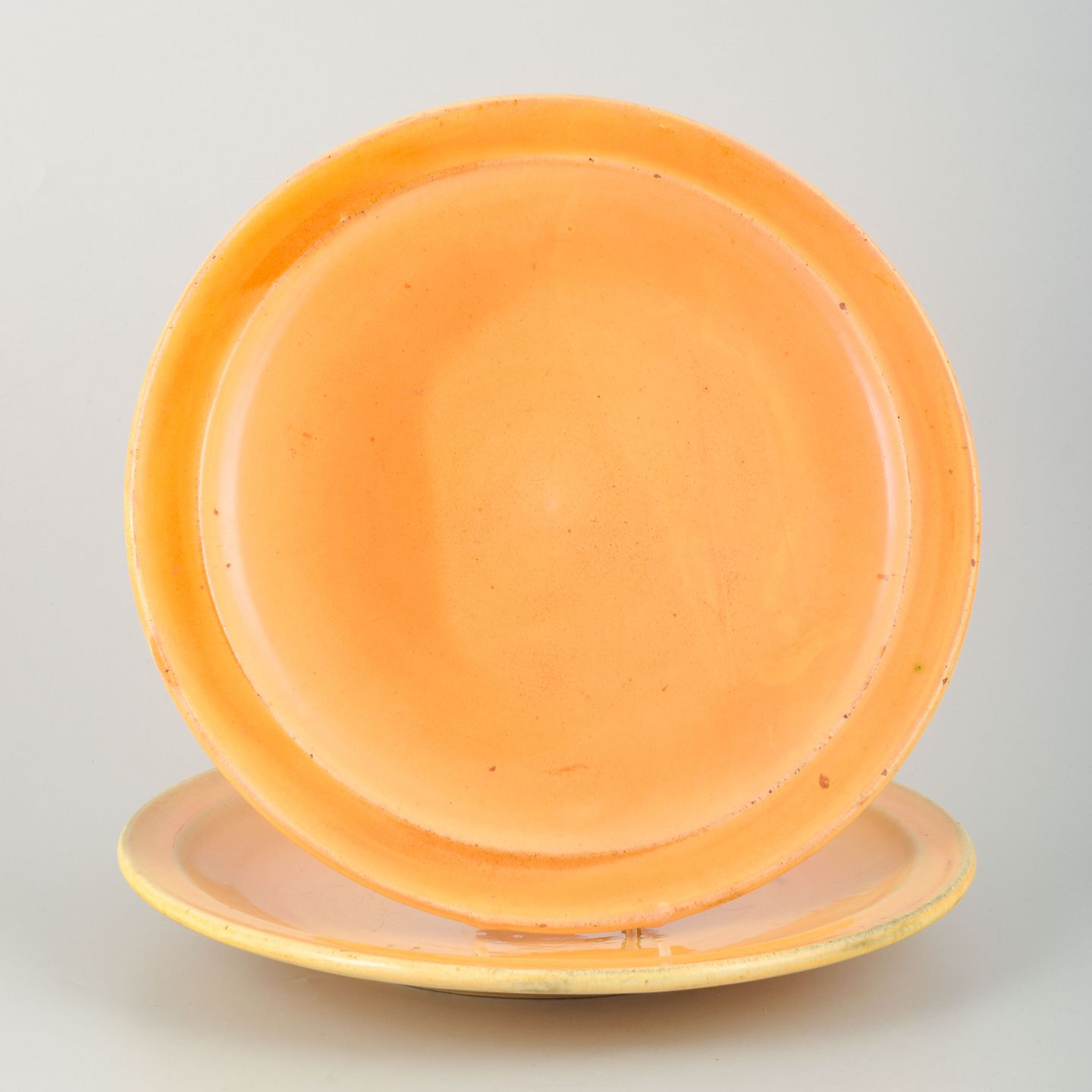 To lave fade designet af Svend Hammershøi for Kähler, udført i 1930’erne. Glaseret i varme gule og brune nuancer med let spil i overfladen, der fremhæver den enkle, funktionelle form. Den lave profil gør fadene velegnede både som serverings- og dekorationselementer.
