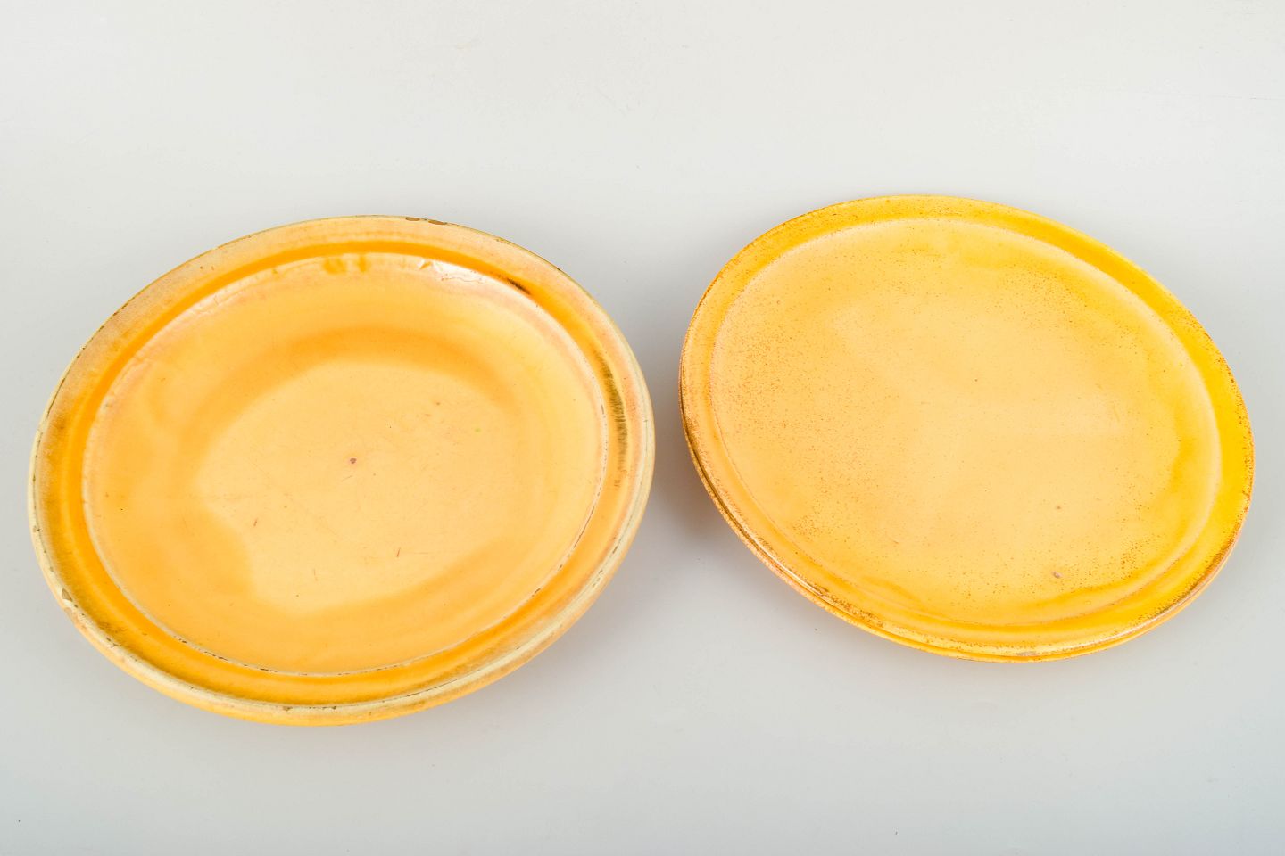 To lave fade designet af Svend Hammershøi for Kähler, udført i 1930’erne. Glaseret i varme gule og brune nuancer med lette variationer i overfladen, som fremhæver den enkle, funktionelle form. Den lave profil gør fadene velegnede både som serverings- og dekorationselementer.