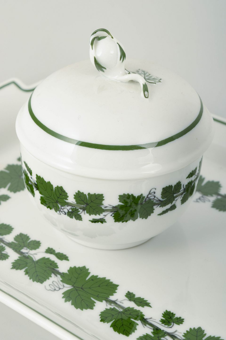 Sæt bestående af porcelænsbakke, flødekande og sukkerskål med låg, dekoreret i det klassiske Vine-Leaf Pattern (“Voller grüner Weinkranz”) med grønne vinblade og slyngende ranker i underglasur. Bakken med grønt kantbånd og bladranke danner en elegant ramme om de to kar, der begge fremstår i harmonisk helhed med mønsteret.