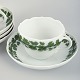 Fire par kopper og underkopper fra Meissen, dekoreret i det klassiske Vine-Leaf Pattern (“Voller grüner Weinkranz”) med grønne vinblade og slyngende ranker i underglasur. Et smukt eksempel på stellets elegante form og præcise håndmalede dekoration.