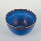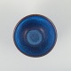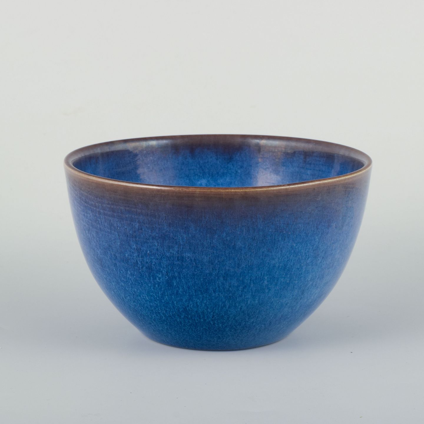 Keramikskål udført af en europæisk studiokeramiker omkring 1970’erne. Skålen har en harmonisk rund form og er dekoreret med en dyb blå glasur, der bevæger sig fra en intens blå nuance i midten mod en mørkere, brunlig kant. Glasuren fremstår levende med fine variationer, der vidner om eksperimenterende studiekeramik fra perioden.