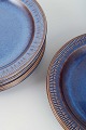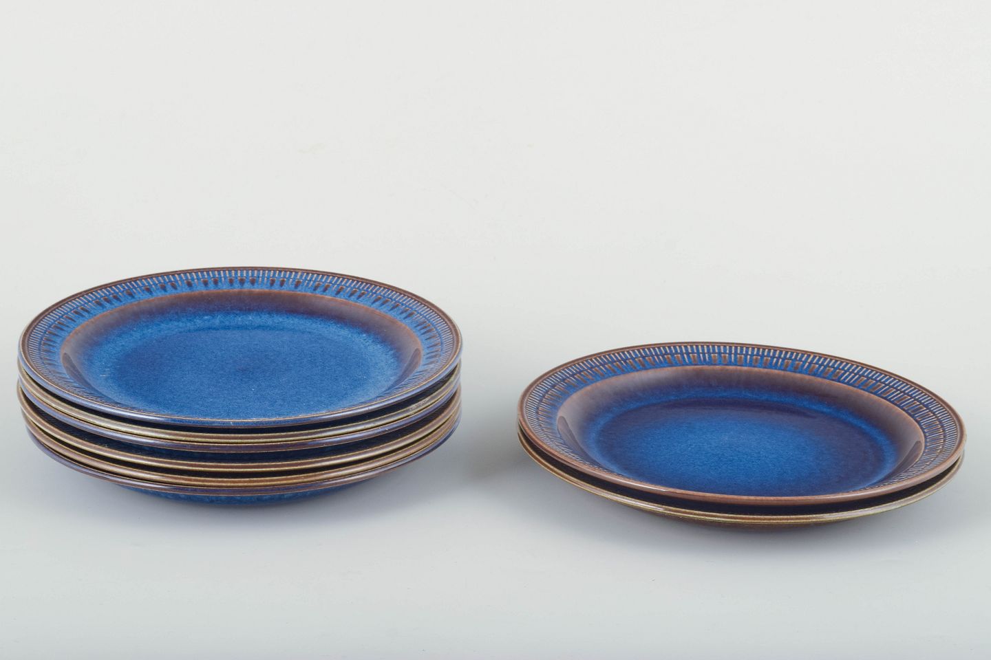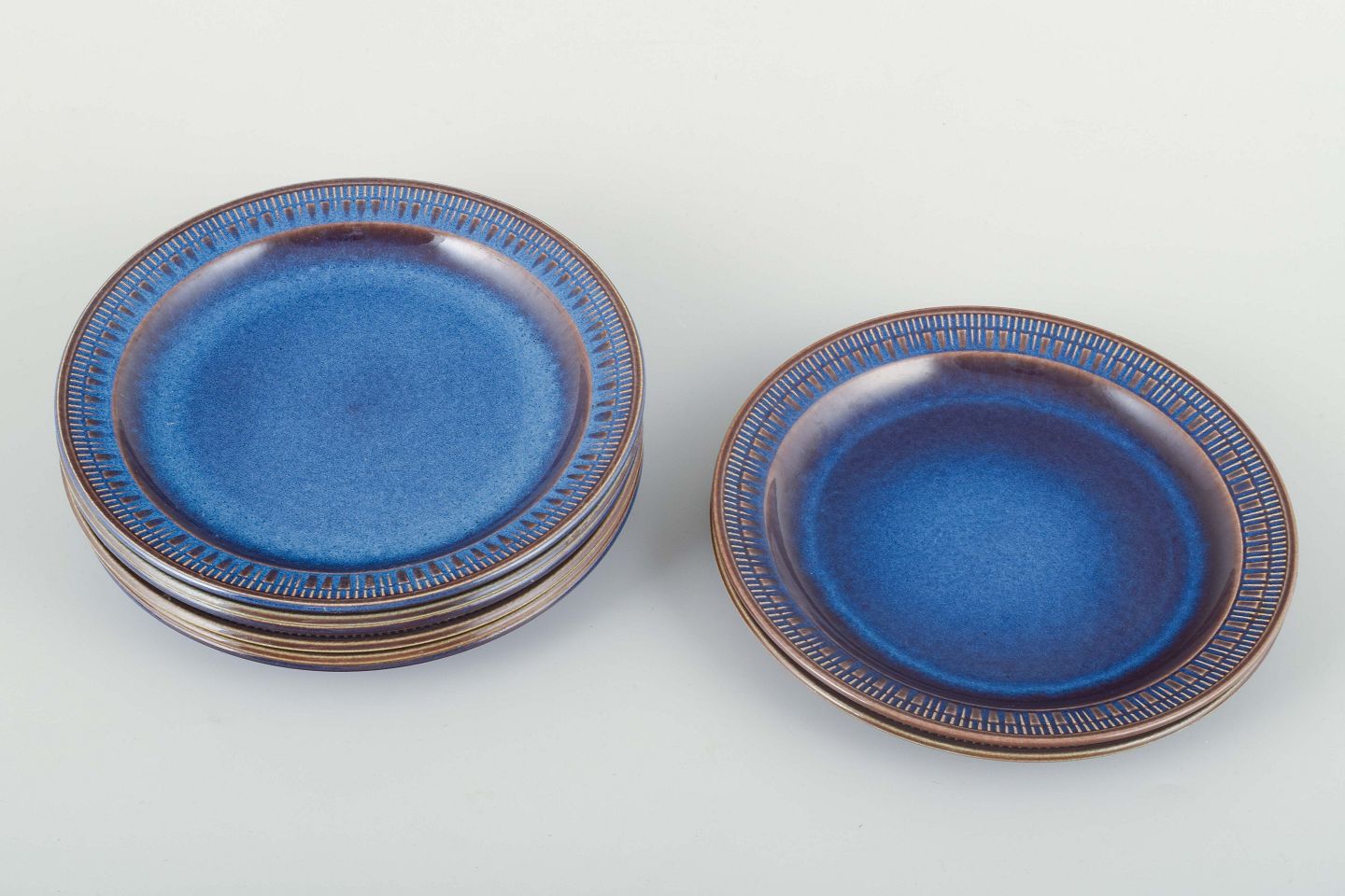 Sæt med 8 små frokosttallerkener fra Gefle, Sverige, i den klassiske stentøjsserie Kosmos. Tallerkenerne er dekoreret med en dybblå glasur med brun kant og karakteristisk relief langs randen, som giver stellet sit særlige, tidstypiske udtryk.