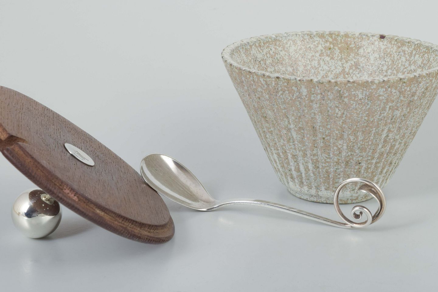 Et raffineret samlerobjekt, hvor Arne Bangs karakteristiske stentøjsformgivning forenes med Hingelbergs sølvsmedearbejde i et elegant funktionalistisk udtryk.