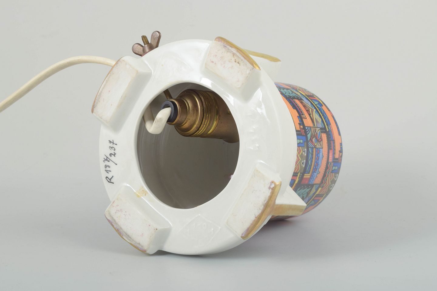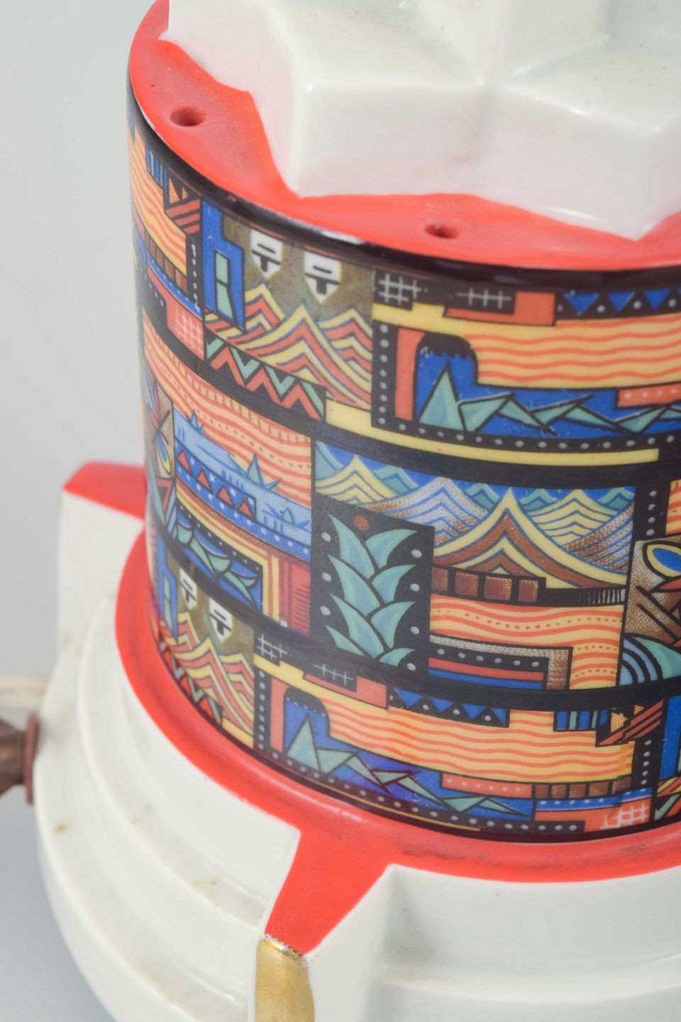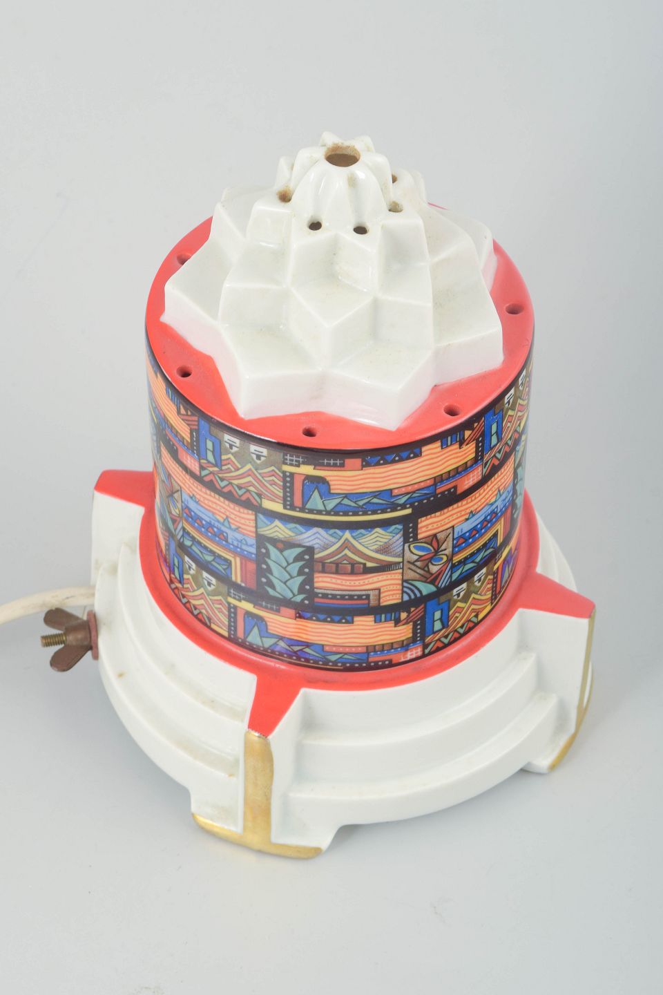 Art Deco duftlampe i porcelæn med geometrisk form. Dekoreret med farverigt, arkitektur- og landskabsinspireret mønster i stærke nuancer af orange, blå, rød og sort. Basen med hvid glasur og detaljer i forgyldning. Elektrisk fatning under bunden.