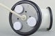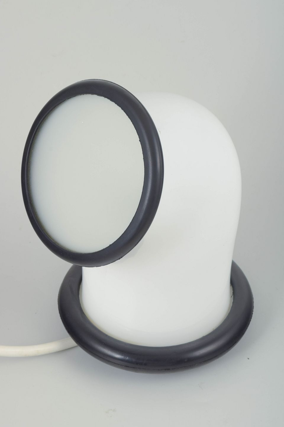 Bordlampe af opalhvidt glas med sorte detaljer, formet i et organisk, næsten skulpturelt udtryk. Lampen har en rund fod med sort ring og et let skråtstillet lysfelt, indrammet af sort kant. Ledning ca. 200 cm.