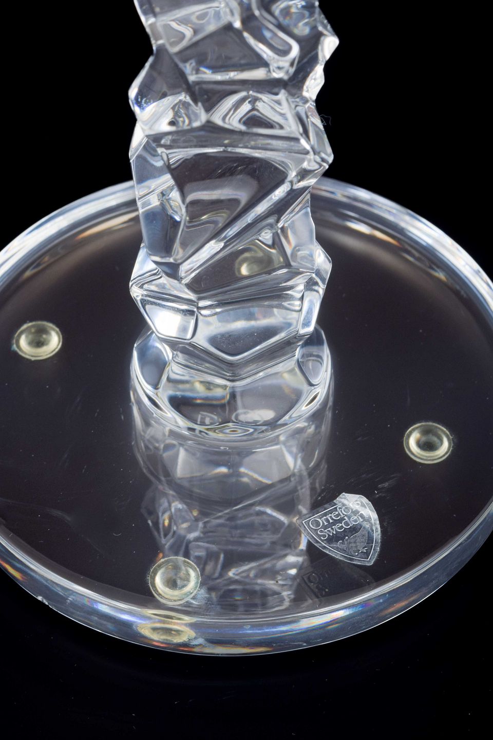 Et elegant og dekorativt eksempel på Orrefors’ kunstglas fra 1970’erne, hvor formsproget forener funktionalitet med en næsten skulpturel karakter.