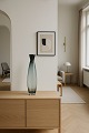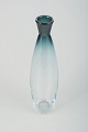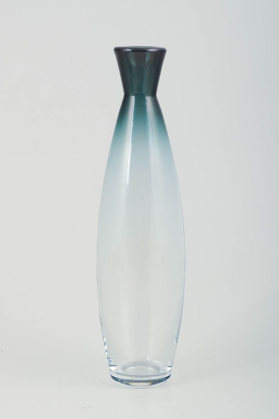 Slank, mundblæst vase i klart glas med konisk korpus og smal hals, tonet fra transparent til blågrøn nuance.