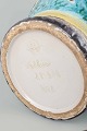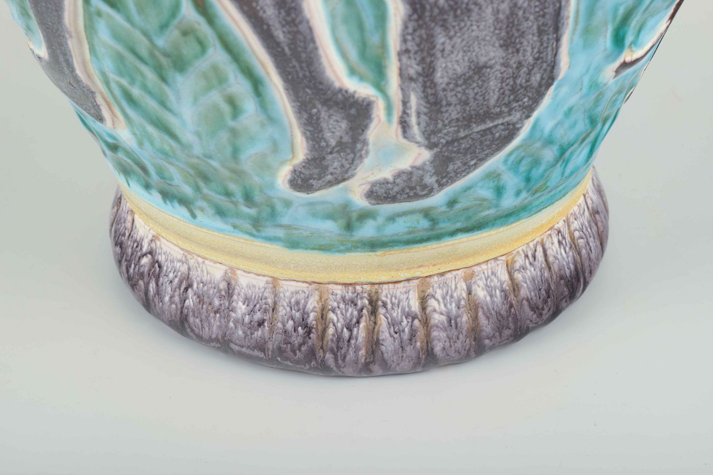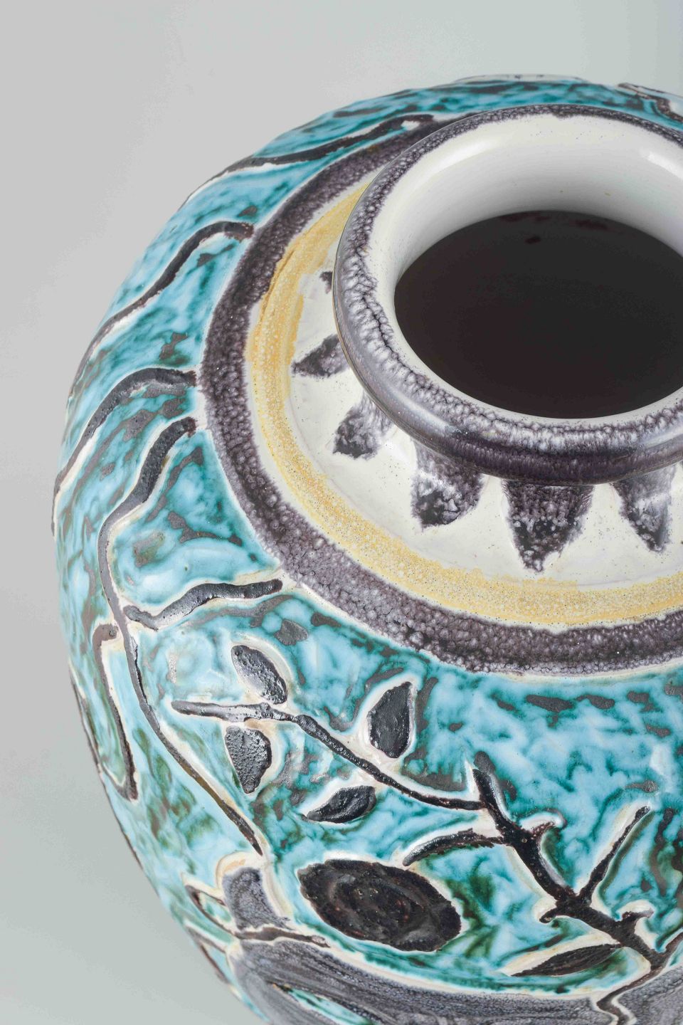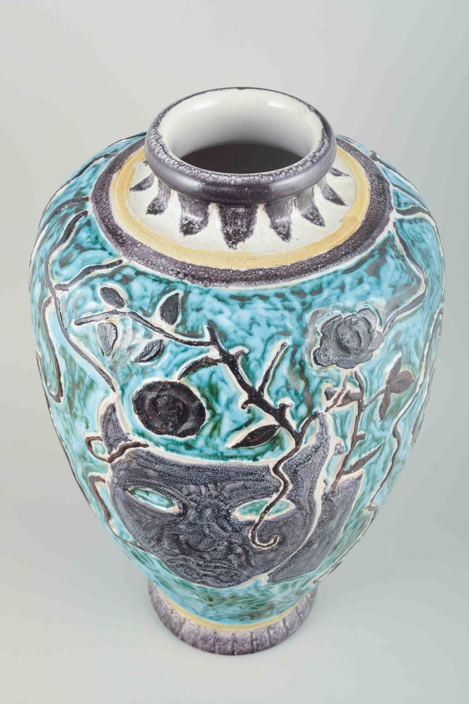 Stor vase i stentøj med turkis, sort og grøn glasur. Dekoreret i relief med ansigt/maske omgivet af slyngende ornamentik.