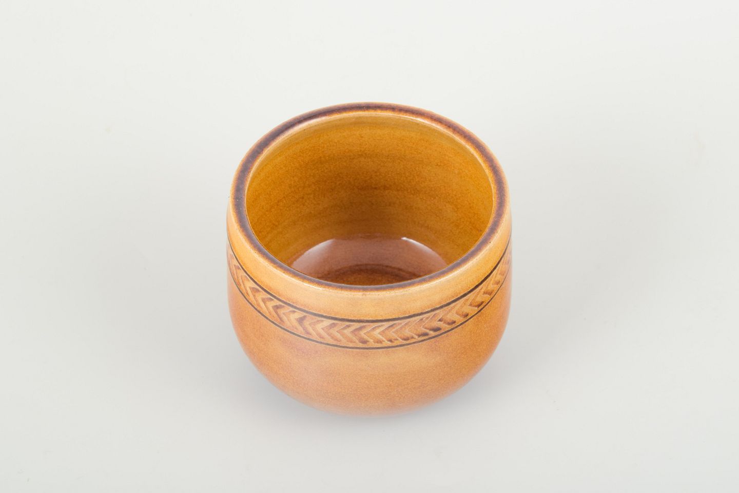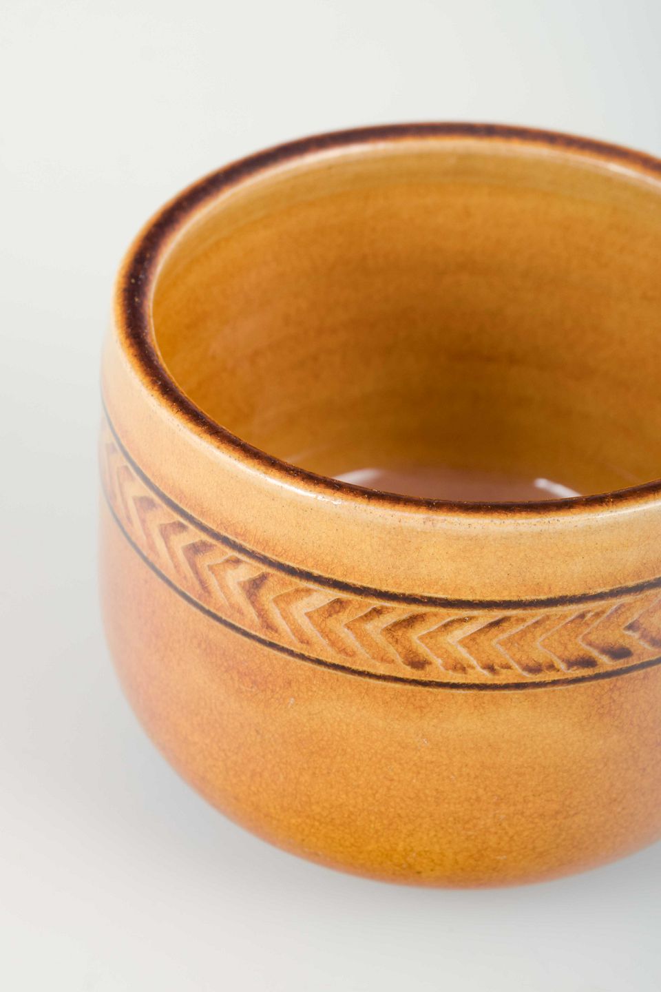 Lille skål i uran-glasur med indpresset zigzag-dekoration.
