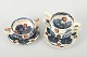 Tre bouillonkopper med tilhørende underkopper, glaseret keramik hånddekoreret med polykrome blomstermotiver i blå, brun og rød glasur på lys bund.