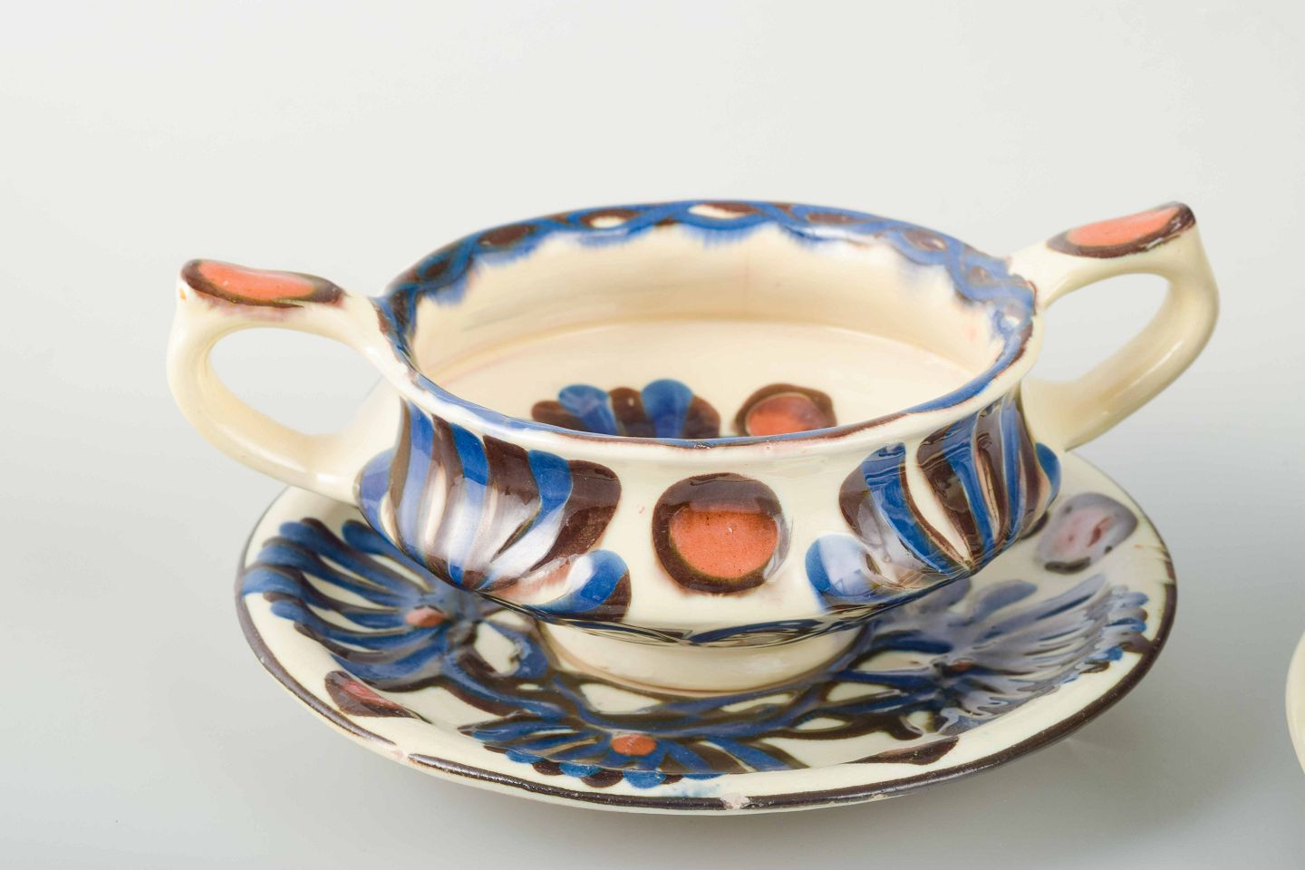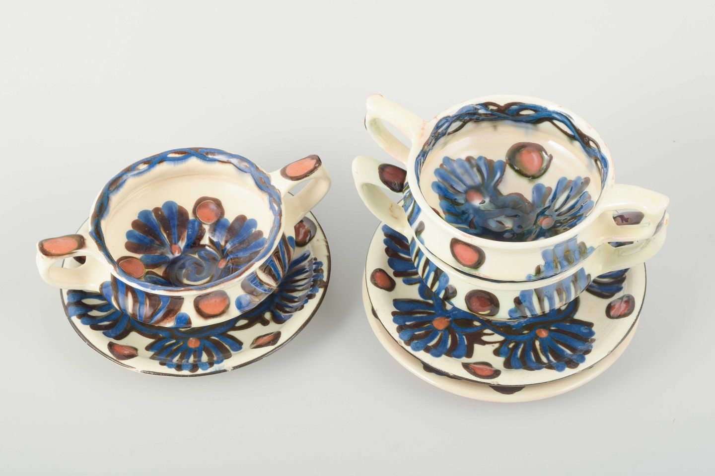 Et dekorativt sæt på tre bouillonkopper med underkopper fra Kählers værksted, hvor traditionelle former og farver forenes i et udtryk, der kombinerer brugskunst med dekorativ folkekunst.