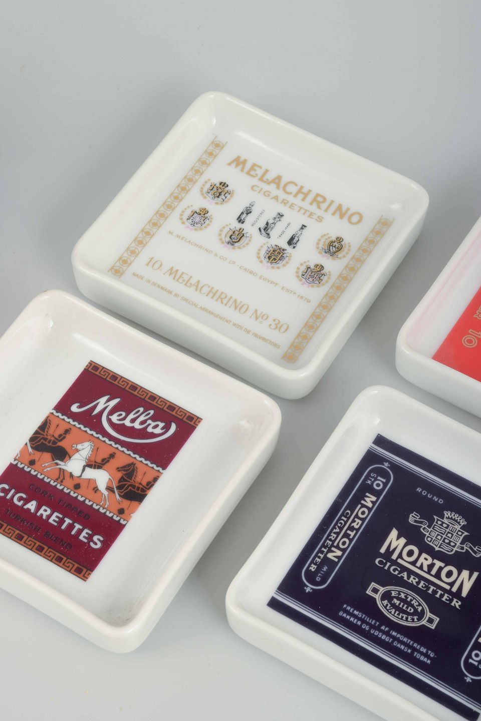 Bing & Grøndahl, grundlagt i København i 1853, er kendt for sit fine porcelæn og sine populære samlerobjekter. I 1980’erne producerede fabrikken også små serier af dekorative brugsgenstande, herunder askebægre med reklame- og tobaksdekorationer. Disse fire eksemplarer afspejler både porcelænskunstens kvalitet og tidens grafiske udtryk. Efter fusionen med Den Kongelige Porcelænsfabrik i 1987 blev Bing & Grøndahl en del af Royal Copenhagen, hvilket gør sådanne genstande til særligt interessante samlerobjekter i dag.