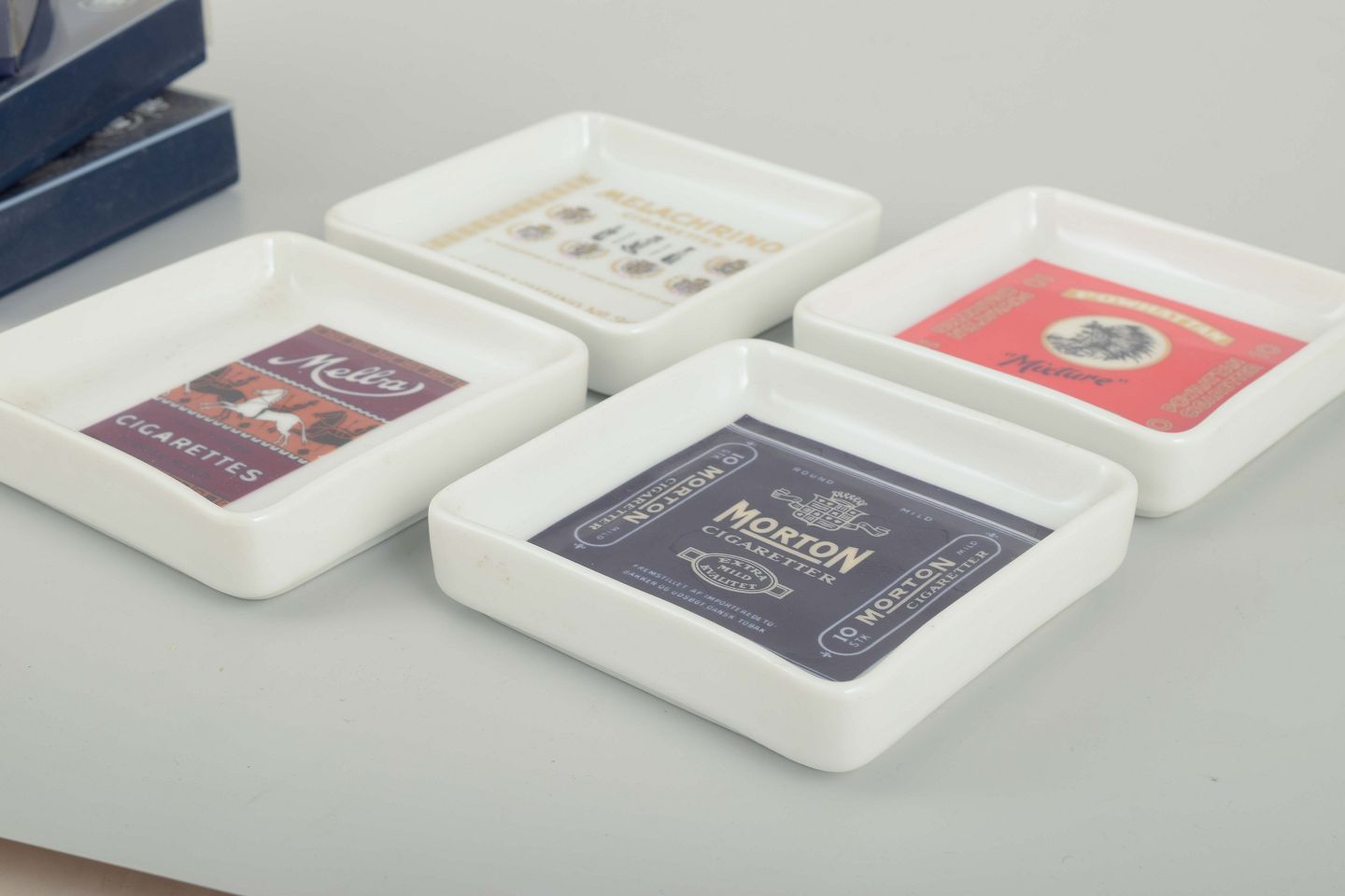 Sæt med fire kvadratiske porcelænsaskebægre, hver dekoreret med klassiske tobaks- og cigarmotiver. Leveres i originale æsker.