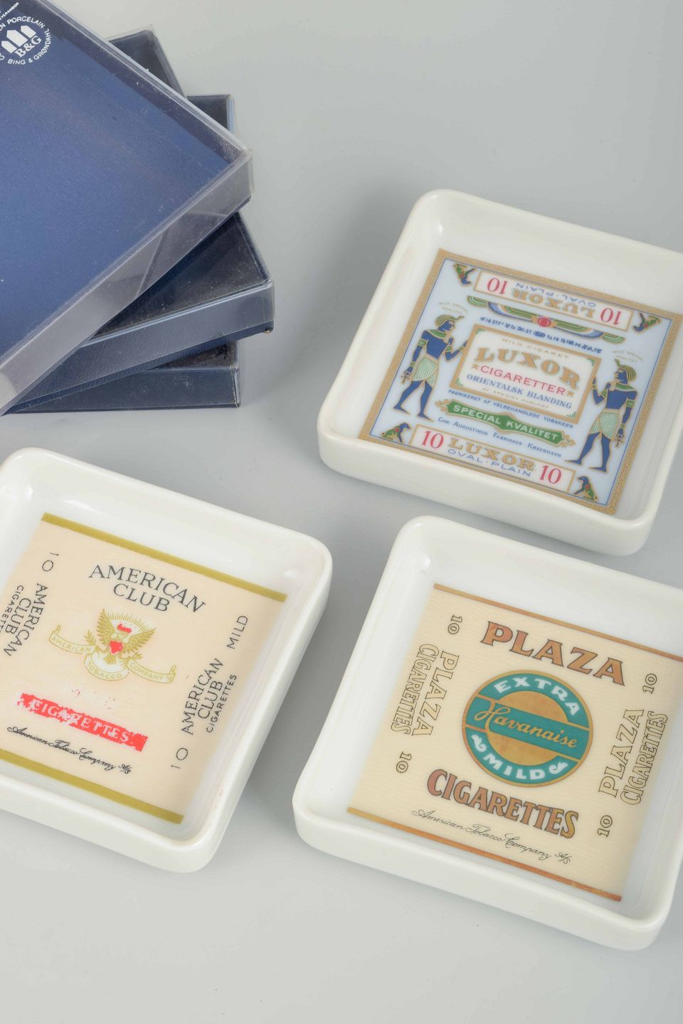 Bing & Grøndahl, grundlagt i København i 1853, er kendt for sit fine porcelæn og sine populære samlerobjekter. I 1980’erne producerede fabrikken også mindre serier af dekorative brugsgenstande, herunder askebægre med reklame- og tobaksdekorationer. Disse tre eksemplarer afspejler både porcelænskunstens kvalitet og tidens grafiske udtryk. Efter fusionen med Den Kongelige Porcelænsfabrik i 1987 blev Bing & Grøndahl en del af Royal Copenhagen, hvilket gør sådanne genstande til særligt interessante samlerobjekter i dag.