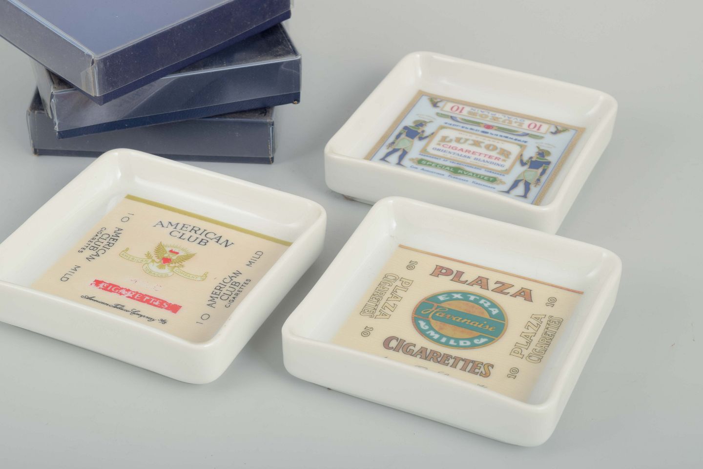 Sæt med tre kvadratiske porcelænsaskebægre, hver dekoreret med klassiske tobaks- og cigarmotiver.