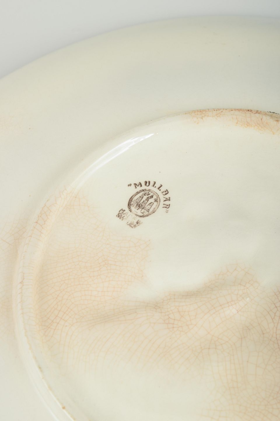 Gefle Porcelainsfabrik blev grundlagt i 1910 i Gävle, men tidligere fajanceproduktion i området går tilbage til 1800-tallet. I anden halvdel af 1800-tallet var transfertryk og reliefdekorerede fajancefade populære og blev fremstillet i store oplag til både husholdning og eksport. Dekorationen “Mullbär” er et typisk eksempel på tidens naturalistiske ornamentik, her med klassiske putti-motiver inspireret af renæssancen og barokken.