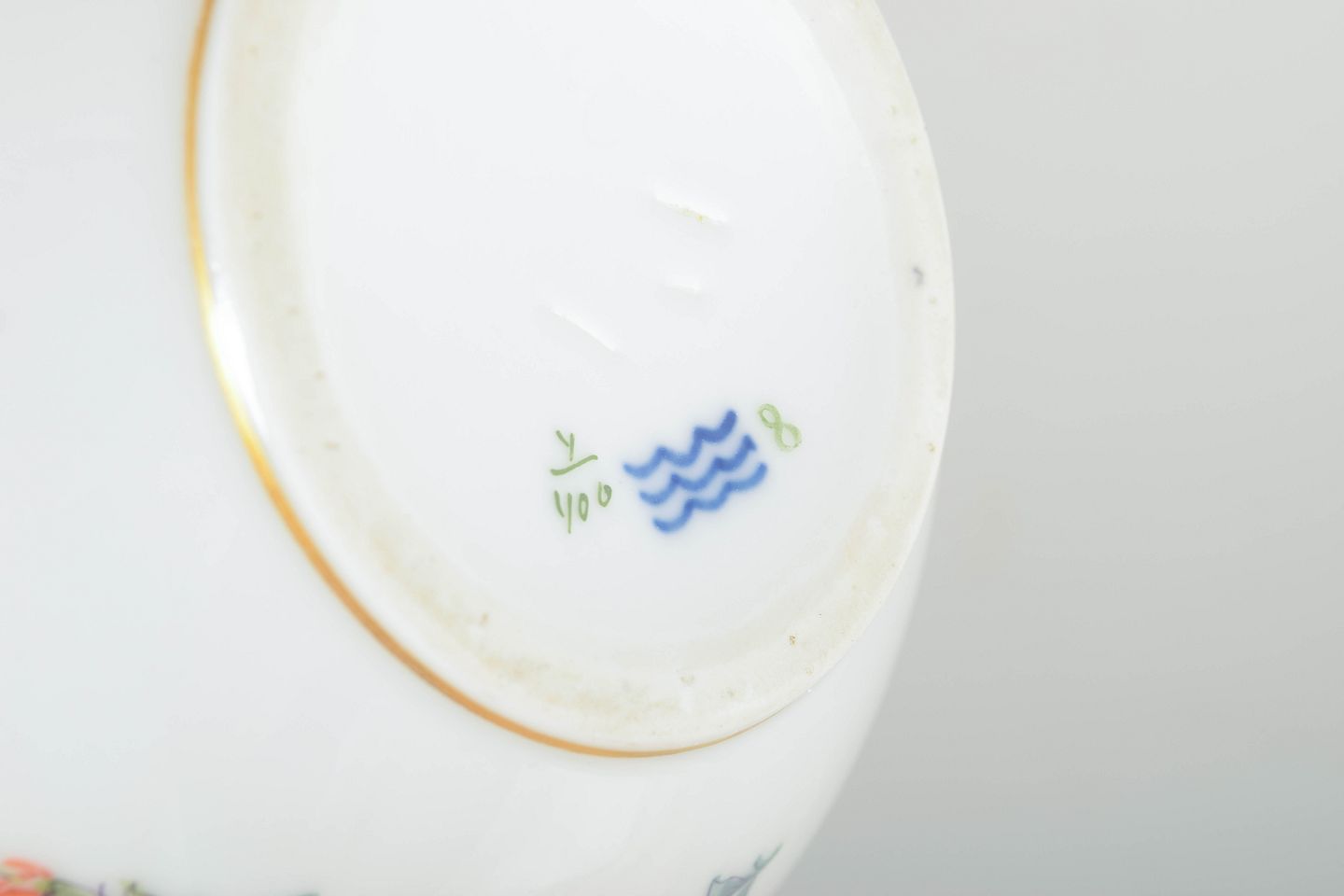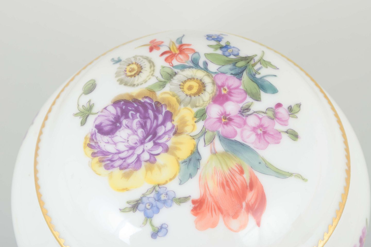 Elegant rund krukke i porcelæn med låg, dekoreret med håndmalede blomster i det klassiske “Sachsisk Blomst” mønster og guldkant.