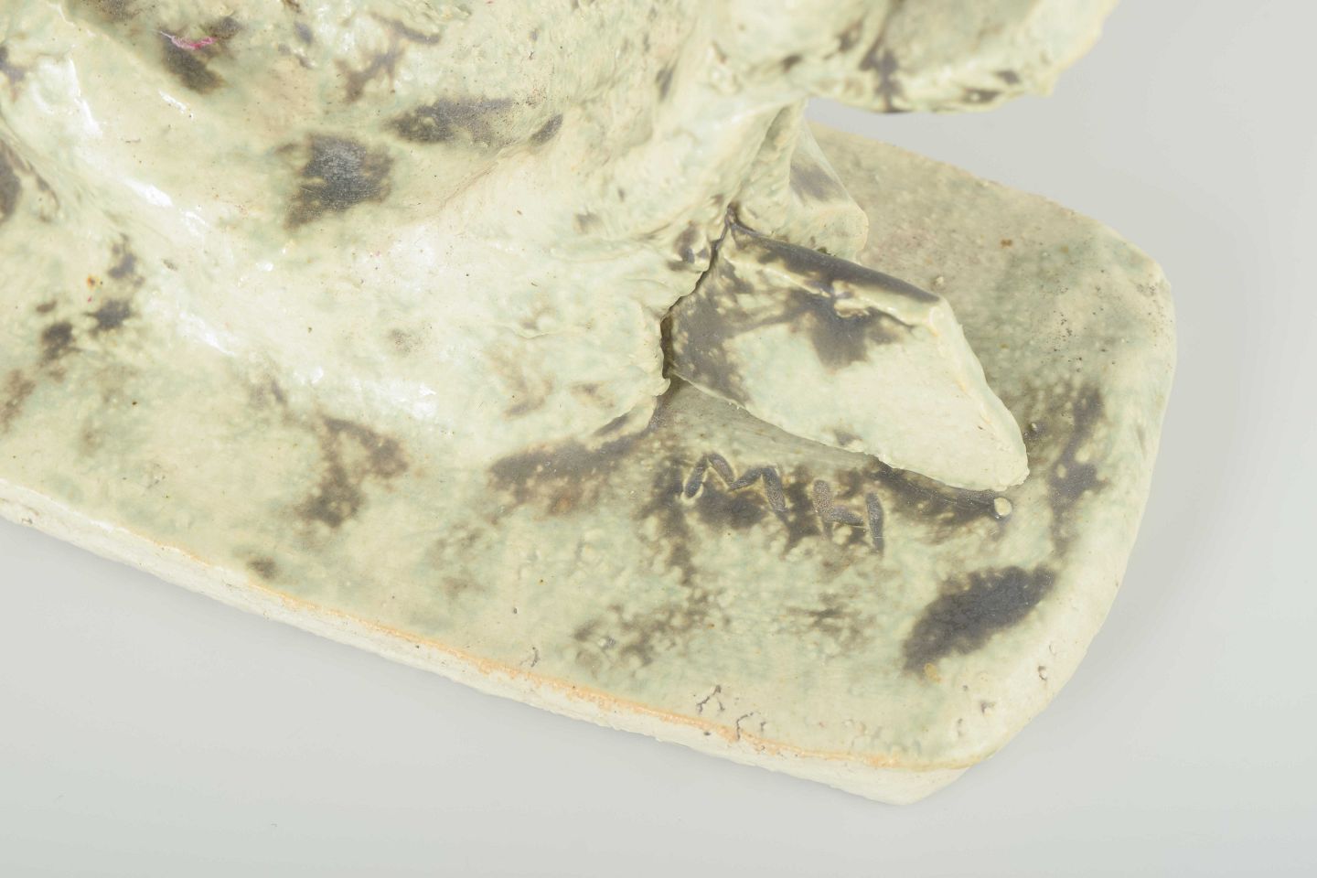 Unik håndformet hovedskulptur i stentøj med lys grønlig glasur og mørke kontraster. De bølgende, foldelignende former omkring ansigtet giver værket et ekspressivt og næsten surrealistisk udtryk. Signeret MH i leret.