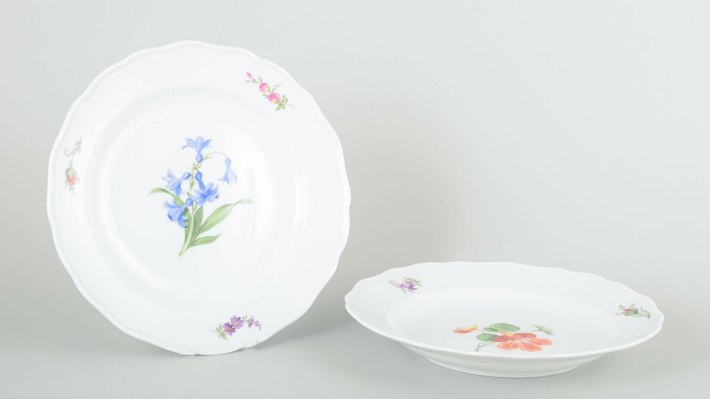To tallerkener i porcelæn, håndmalede med blomsterdekorationer i flerfarvet palet. Klassisk bølget kantprofil med relief og delikat staffering.