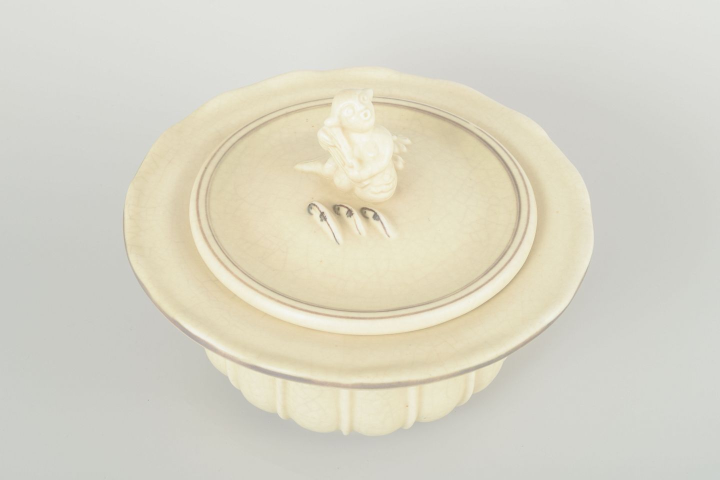 Art Deco lågkrukke i fajance med reliefdekoreret korpus og låg med figurativ knop forestillende abe. Glasur i klassisk cremefarvet craquelé med let violette skygger. Model nr. 117/138.