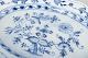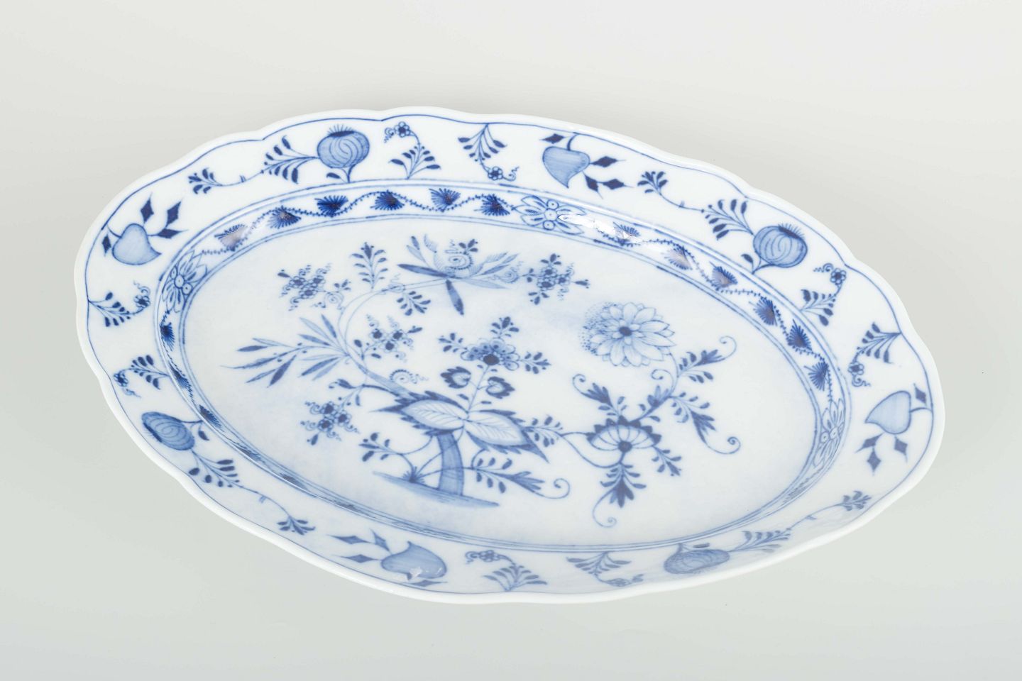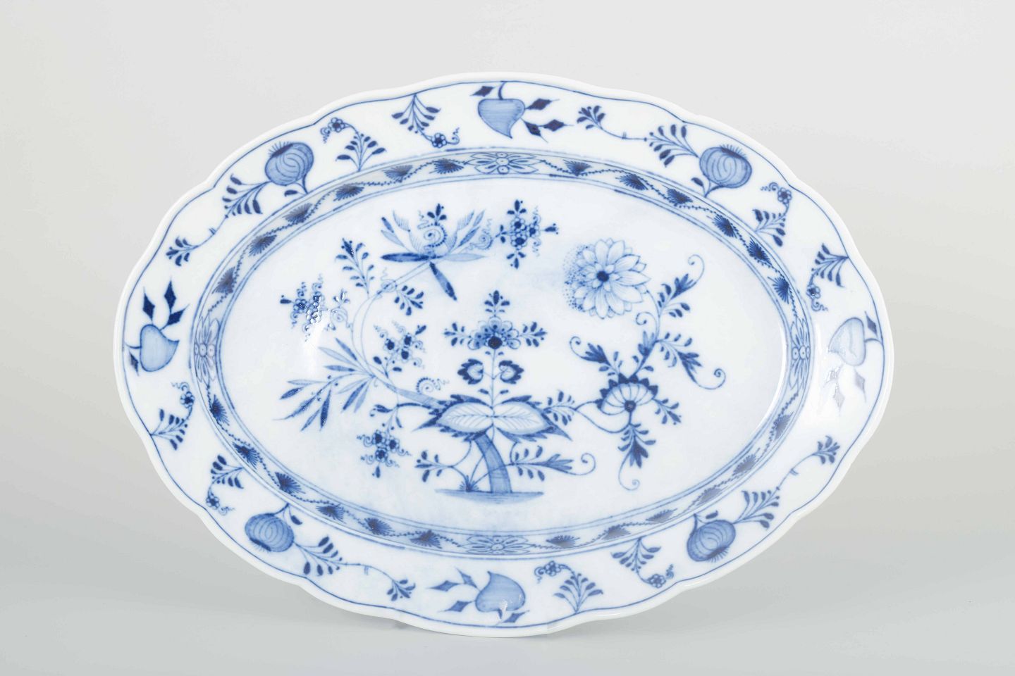 Elegant ovalt serveringsfad i porcelæn, håndmalet i det klassiske “Blue Onion” (løgmønstret) mønster i koboltblå. Dekoreret med stiliserede blomster, frugter og løgornamentik – et ikonisk Meissen-design siden 1700-tallet.