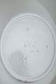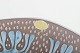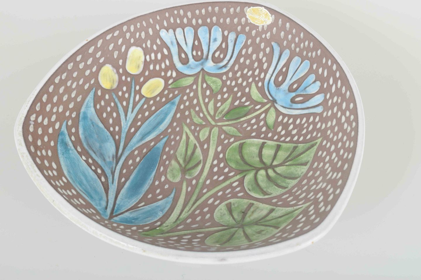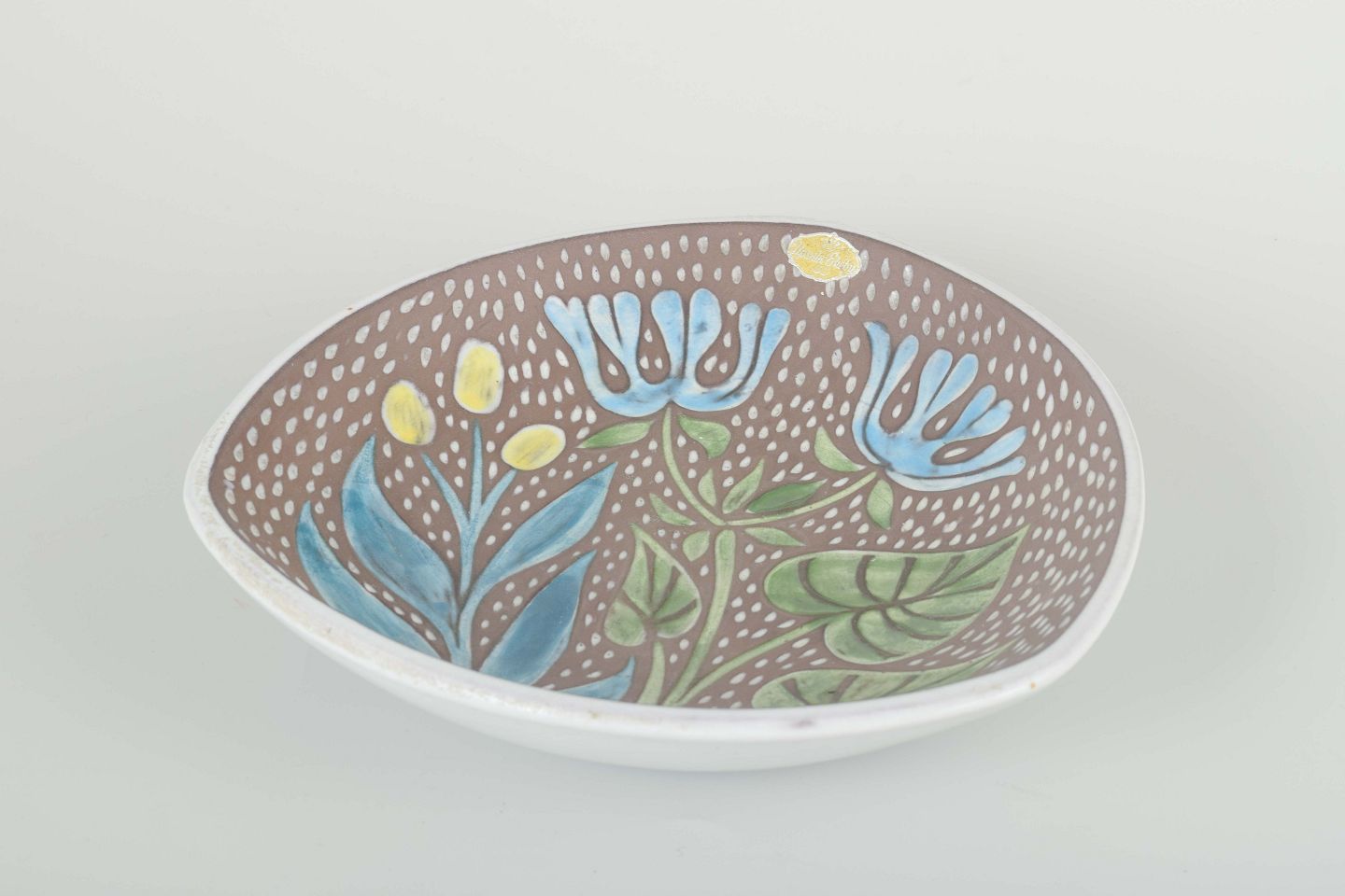 Dekorativt fad i glaseret keramik med reliefmønster af blomster i blå, grønne og hvide nuancer mod brun baggrund.