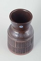 Cylindrisk vase i stentøj med geometrisk reliefdekor i matte og glaserede bruntoner.