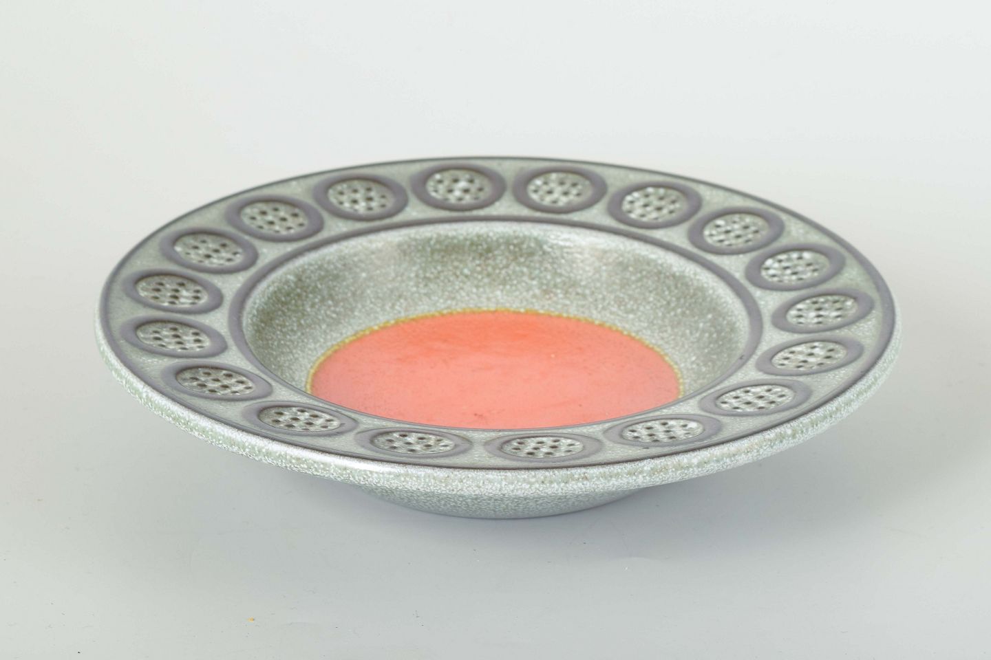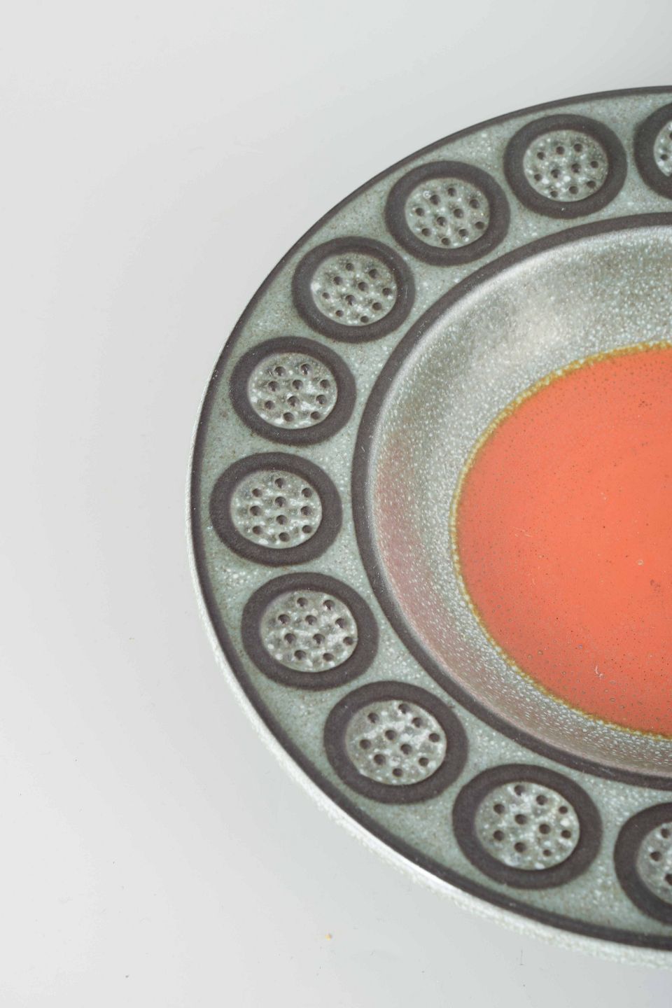 Dekorativ skål i stentøj med orange glasur i midten, omgivet af sølvgrå og mørkebrune felter med cirkulær reliefdekoration langs randen.