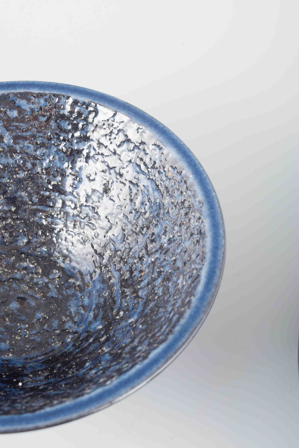 To konisk formede skåle i stentøj med dyb, mørkeblå glasur med let krystallinsk struktur.