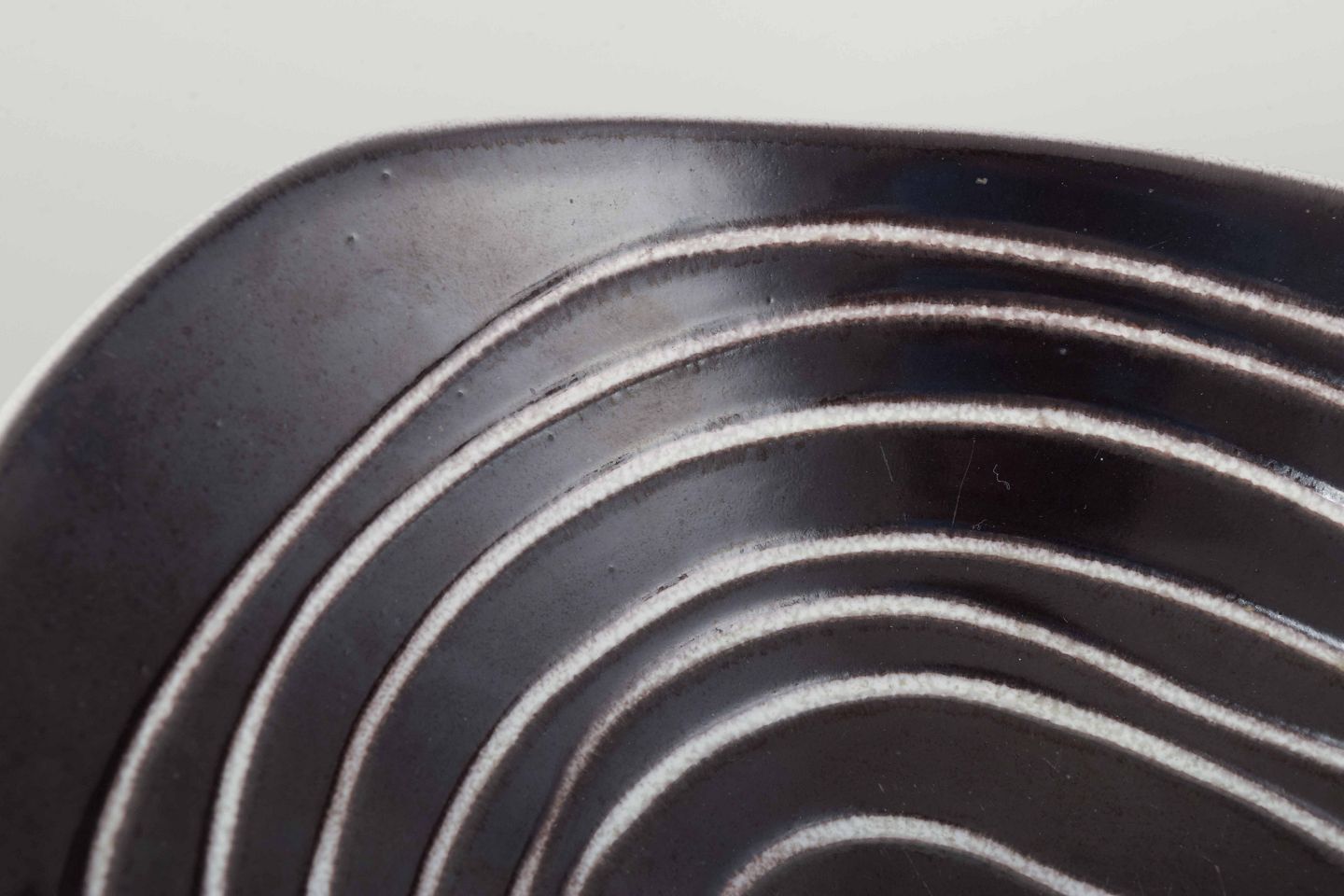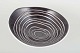 Asymmetrisk formet skål i fajance med hvid glasur udvendigt og mørkgrå glasur med hvide linjer indvendigt.