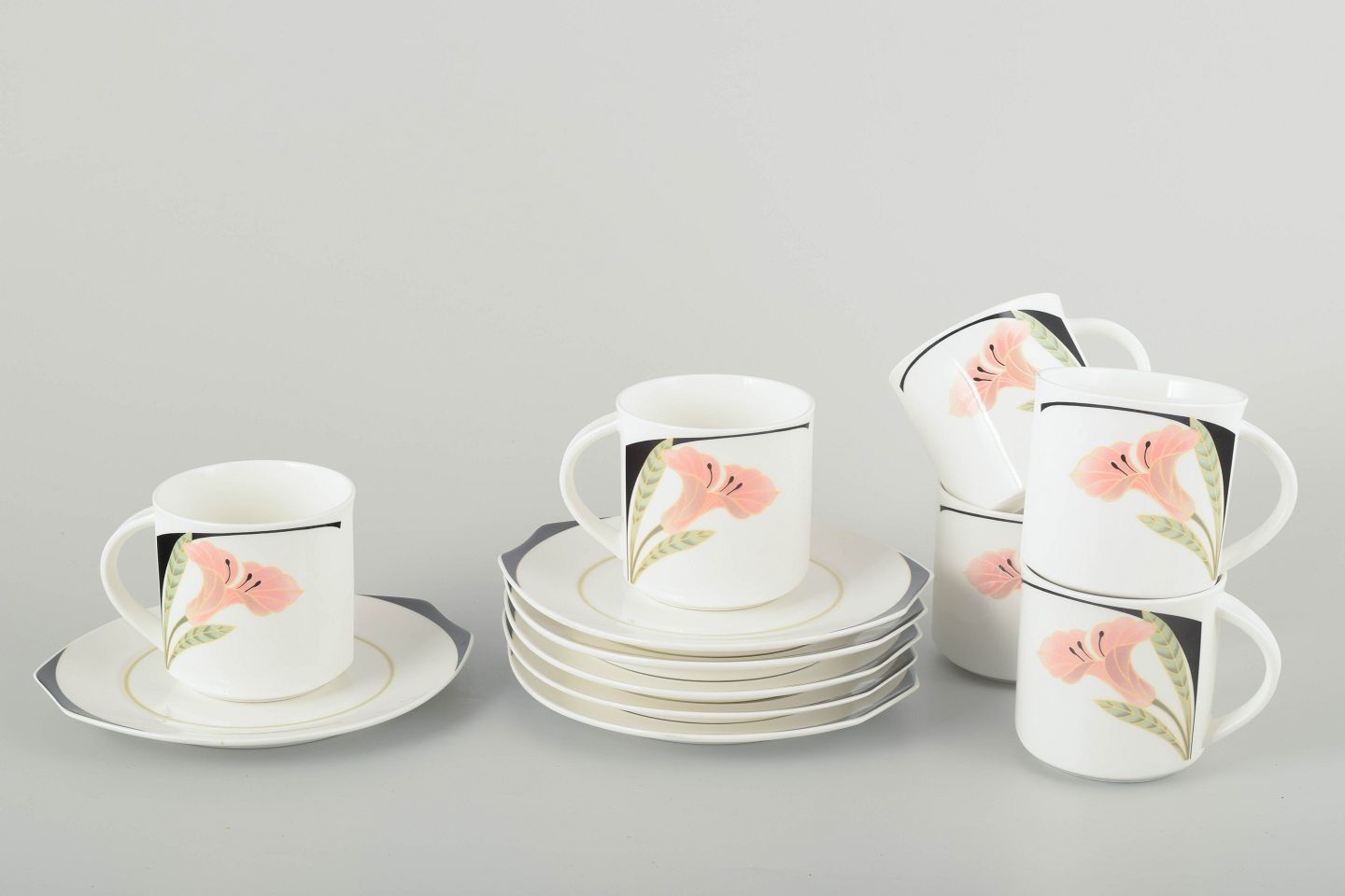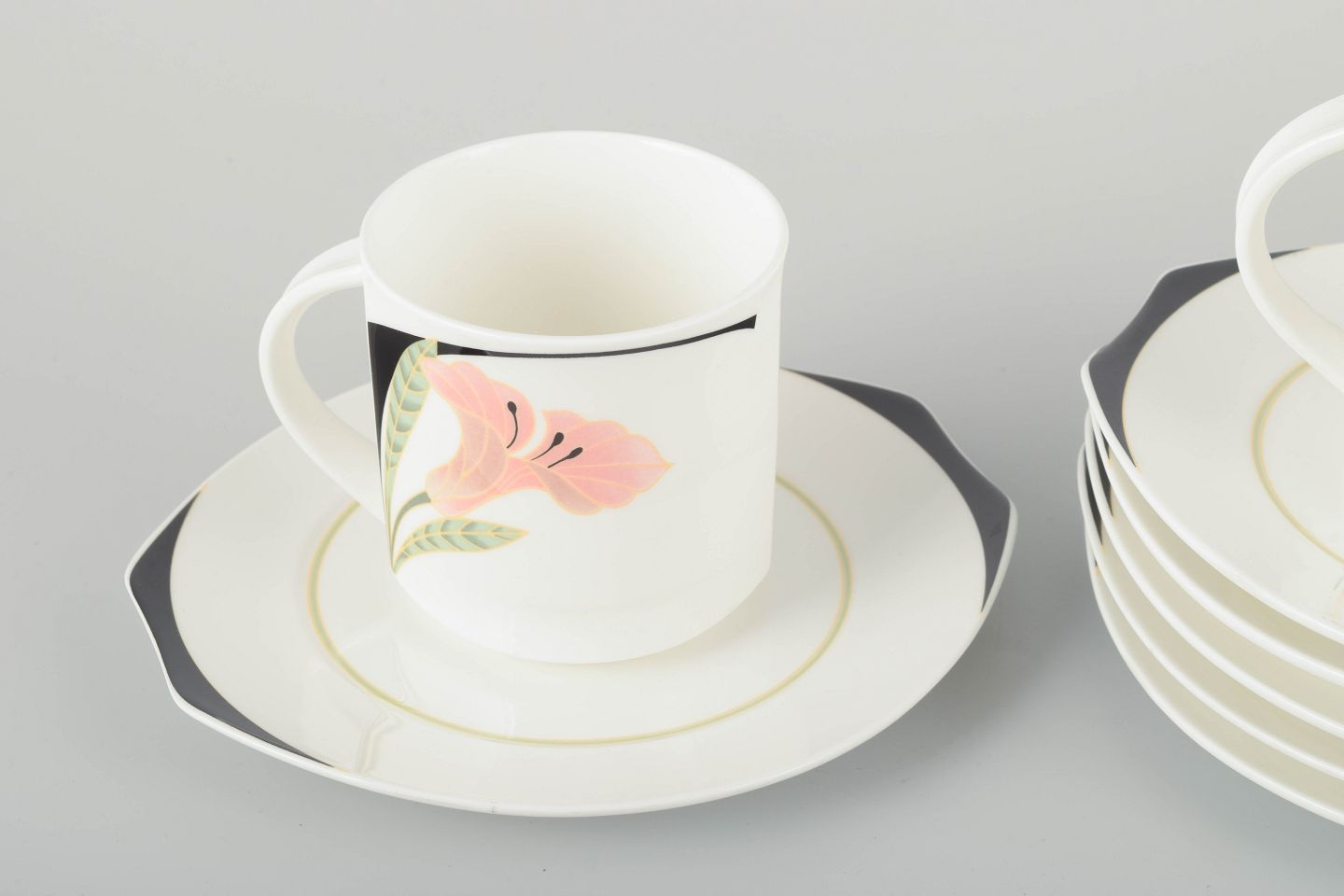 Seks porcelænskopper med tilhørende underkopper, dekoreret med håndmalede blomster i rosa, grønne og sorte nuancer. Serien kombinerer rene linjer og bløde former med et elegant postmodernistisk udtryk.