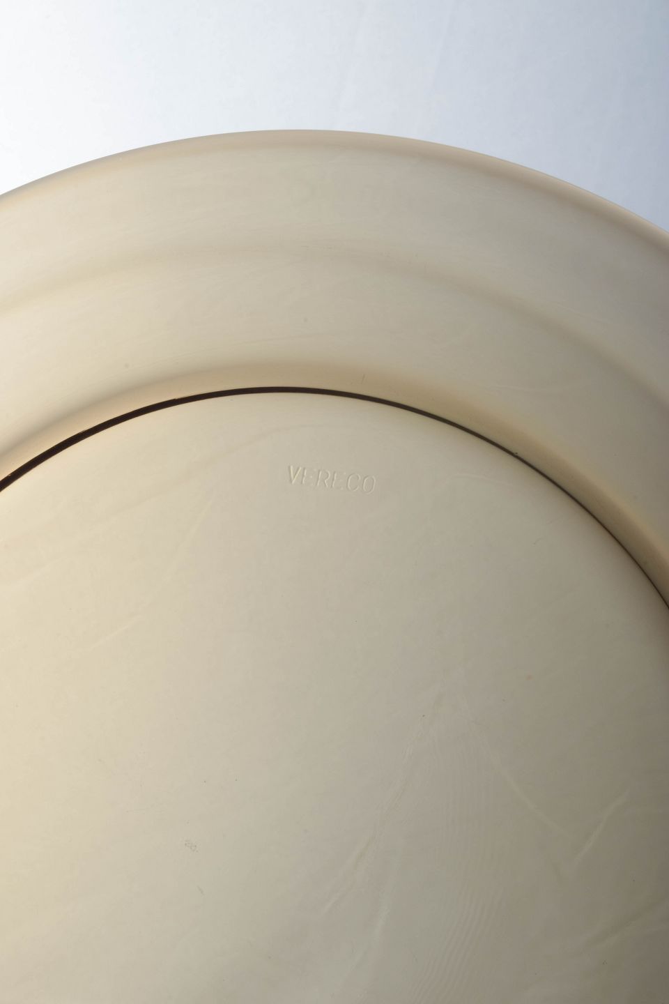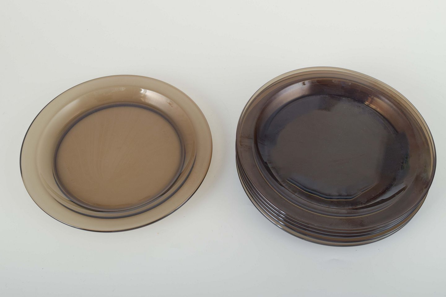 Sæt bestående af seks tallerkener i røgfarvet glas. Klassisk fransk design fra Vereco, kendt for sit funktionelle glas med enkle linjer og varme toner, typisk for 1970’ernes formsprog.