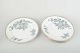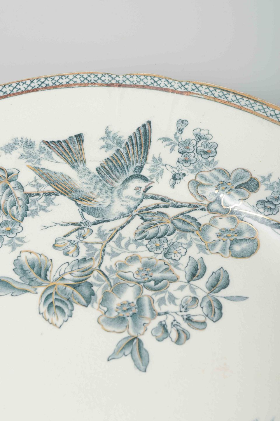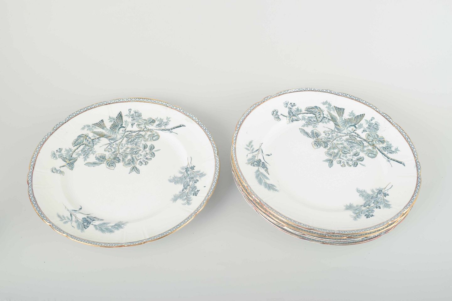 Fem middags­tallerkener i fajance med dekoration af fugl og blomstergren i blågrønne nuancer samt dekorativ bort langs kanten.