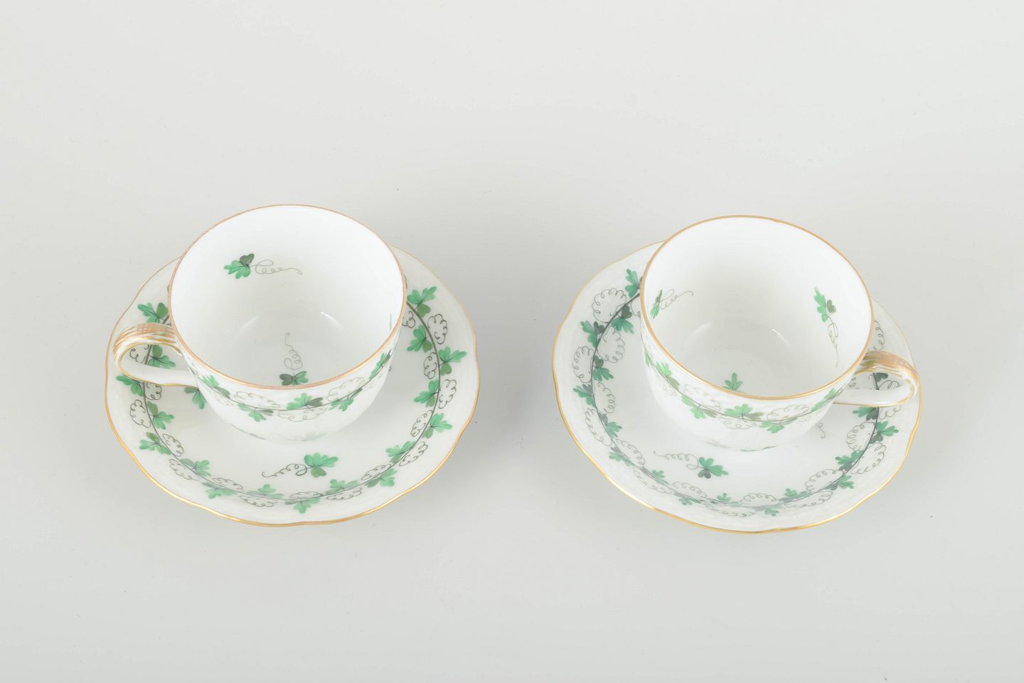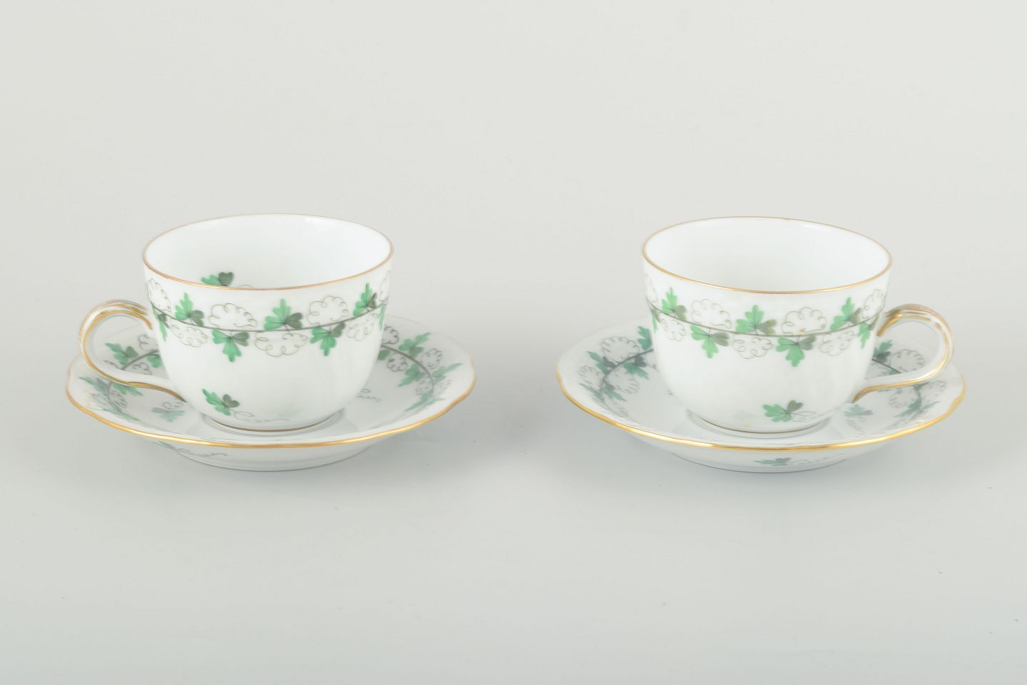 Elegant porcelænsservice med håndmalet grøn blomsterranke og forgyldte kanter. Klassisk Herend-dekoration med fine detaljer og let buet form.