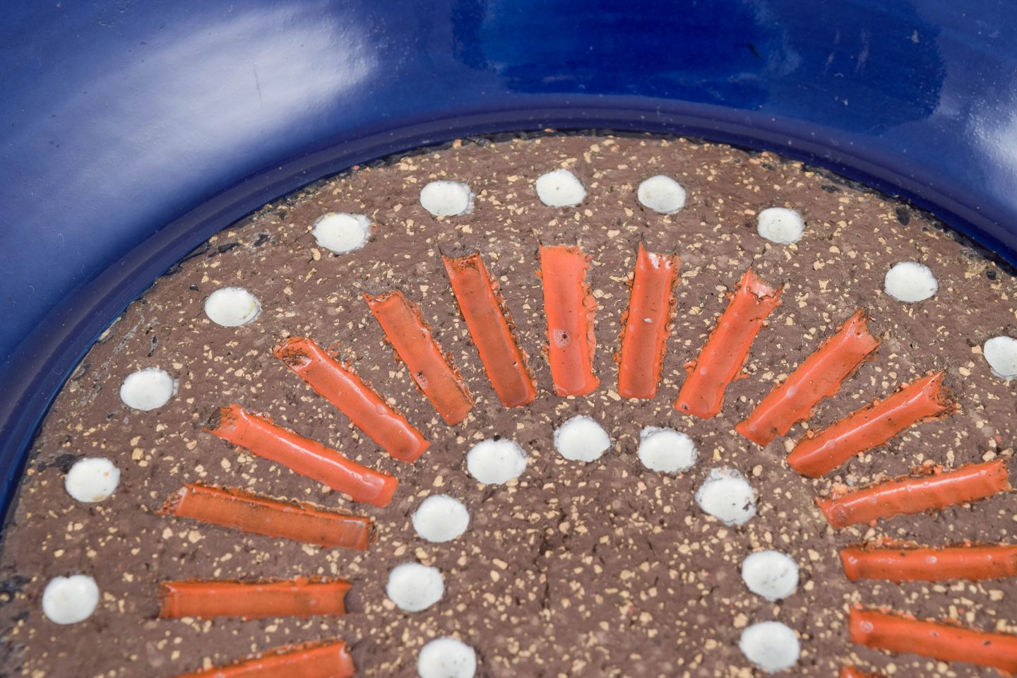 Hånddekoreret keramisk fad med mørk, grov chamottebund og radiært orange reliefmønster, omgivet af hvide prikmotiver — indrammet af en dyb, blank kongeblå glasur.