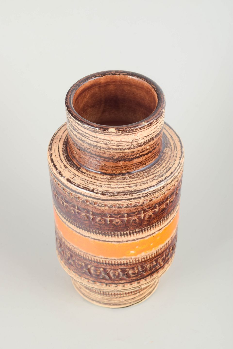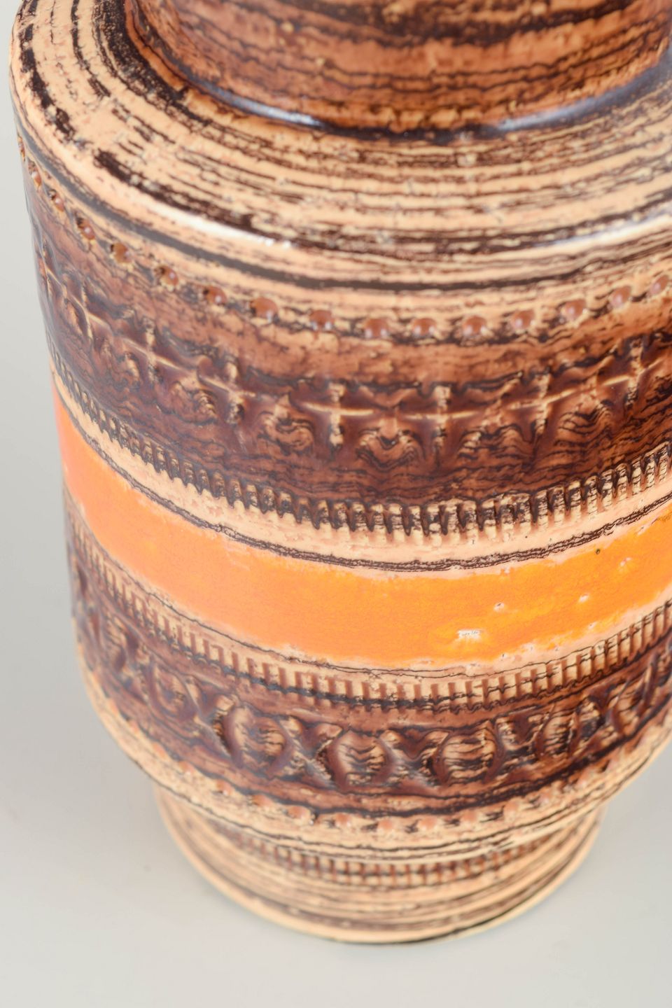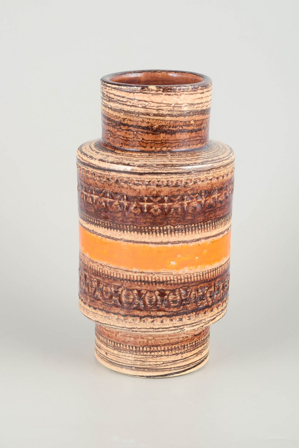 Cylindrisk stentøjsvase med karakteristiske indgraverede bånd og varm orange-brun glasur i relief.