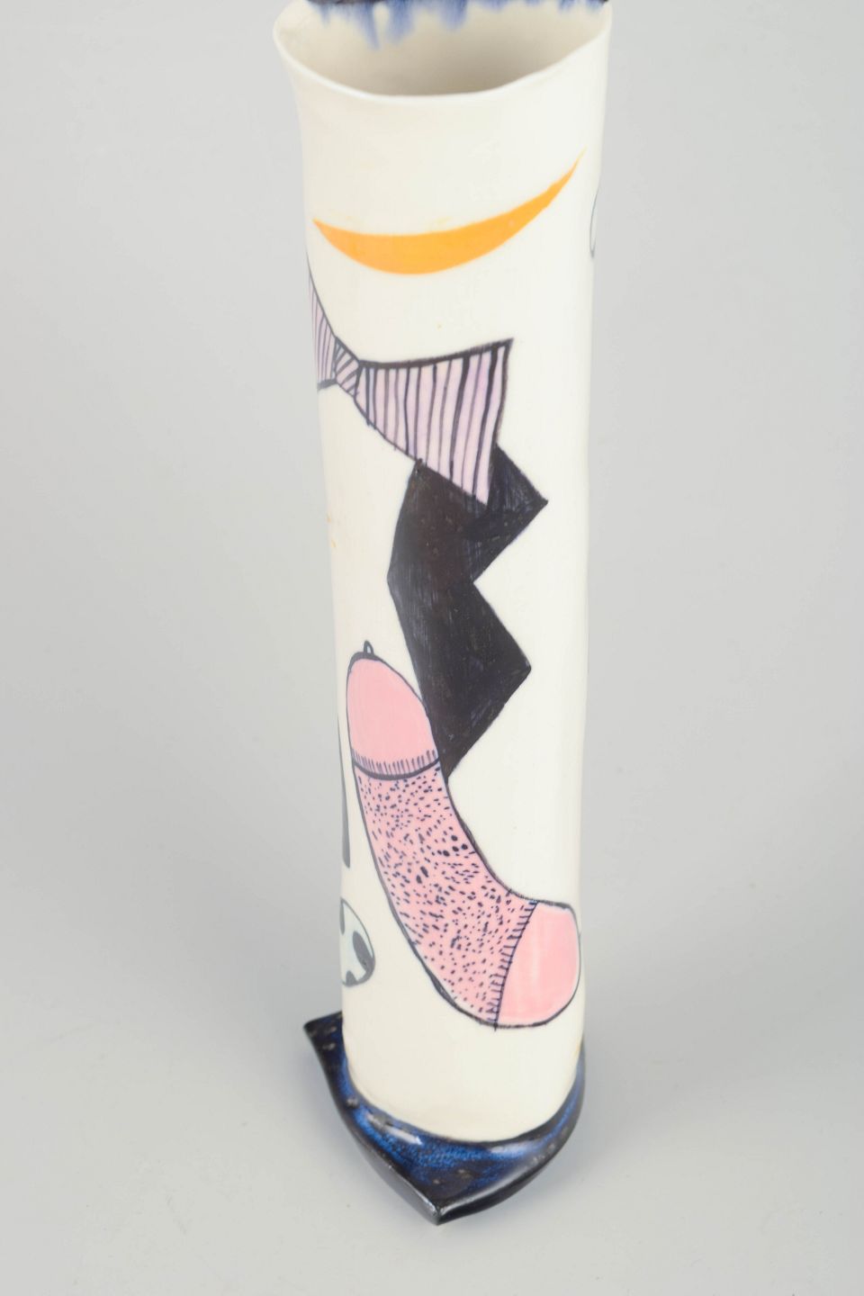Håndlavet triangulær studiovase i hvidglaseret stentøj med grafisk, Memphis-inspireret dekoration i blå, gul og sorte toner.