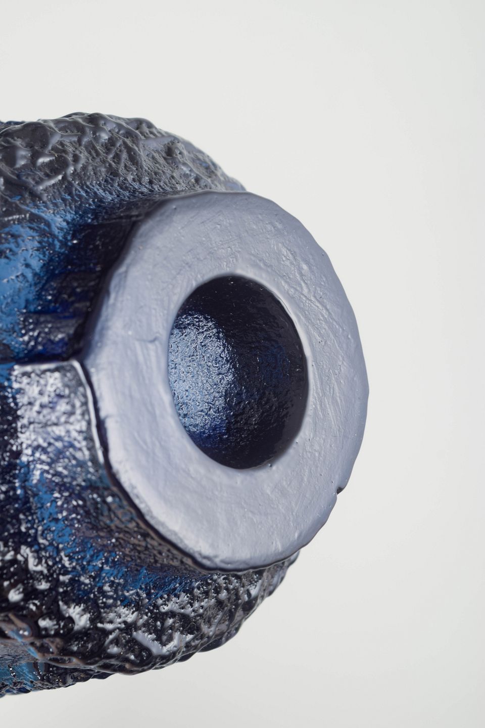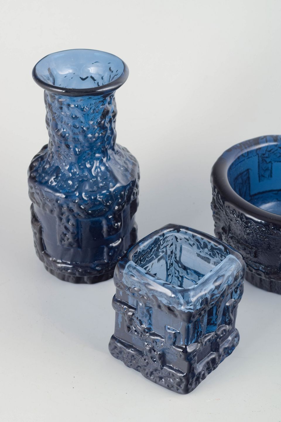 Mundblæste, skulpturelle glasvaser i dyb kobaltblå farve med markant isstruktur/relief — én høj cylindrisk vase, én firkantet og én skålformet. Et karakteristisk brutalistisk udtryk fra Ruda Glasbruk i 1970’erne.