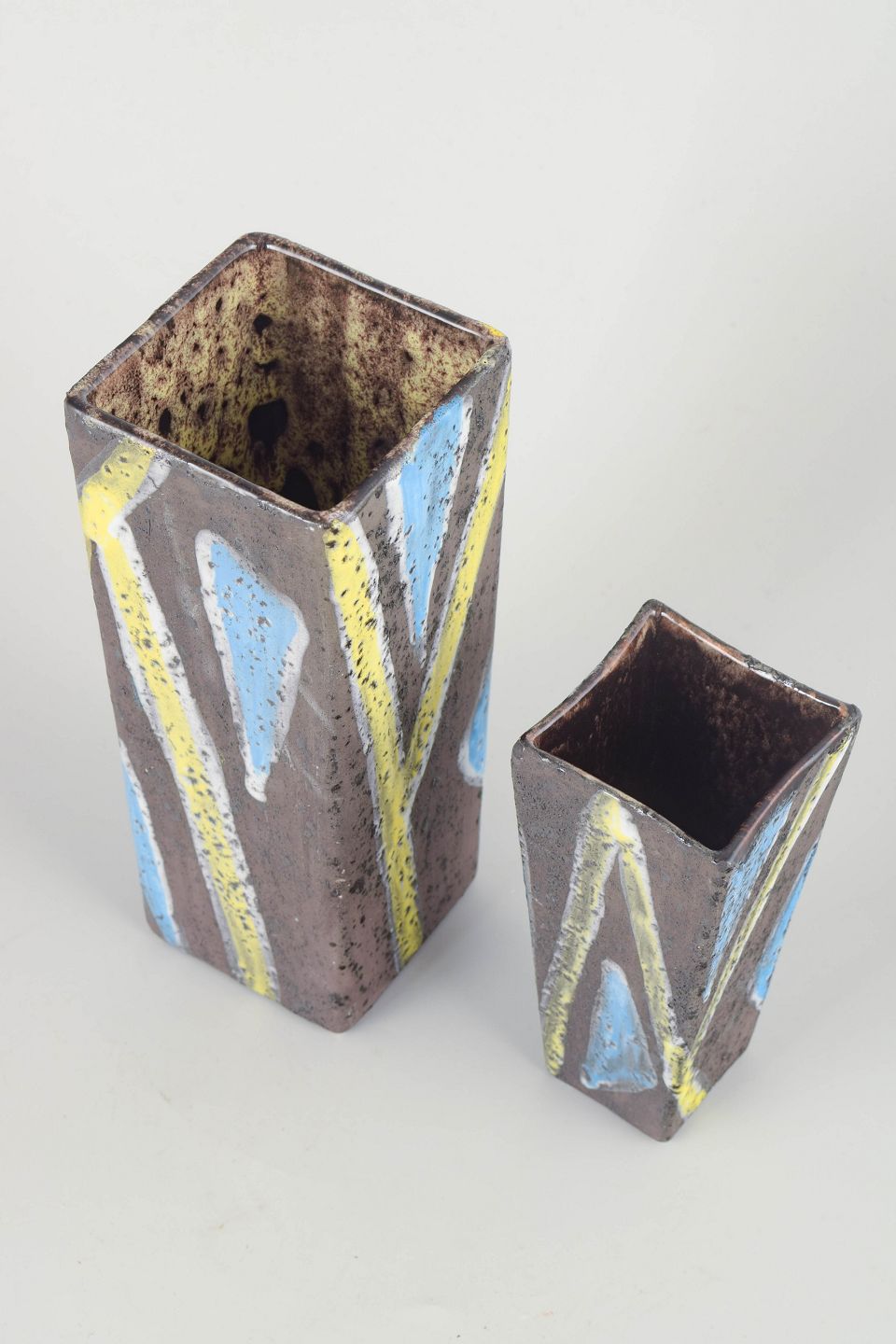 To unikke rektangulære keramiske vaser med grafisk håndmalet dekoration i relief med blå, gul og hvid glasur på mat brun chamotte-lignende stentøjsoverflade.