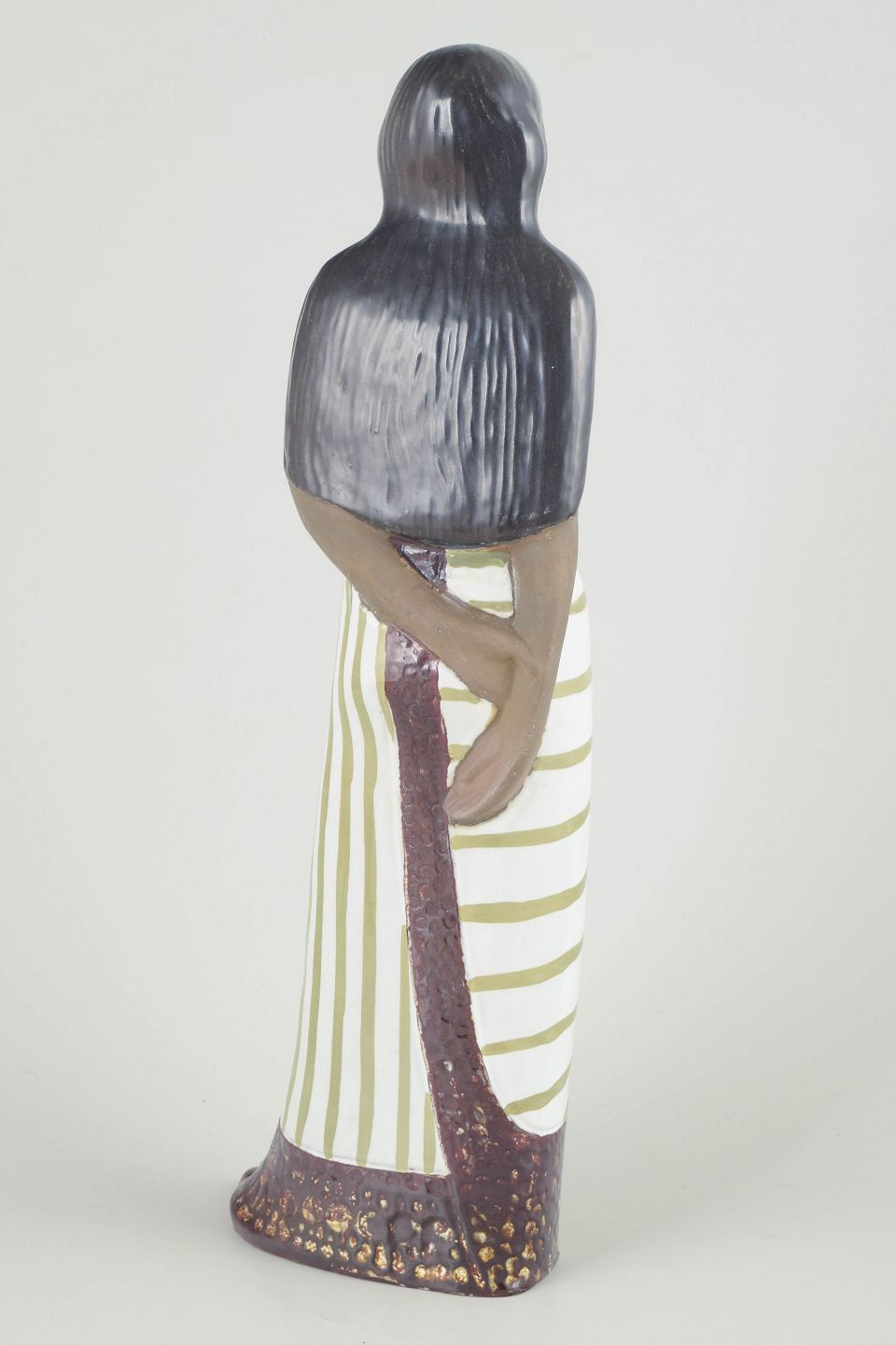 Stor håndmalet keramikfigur af en kvinde med langt hår, iført hvid kjole med grønne diagonale striber og brun dekorationskant med tekstur. Et elegant og roligt arbejde af Mari Simmulson, kendetegnet ved hendes karakteristiske stiliserede form og varme farvepalet.