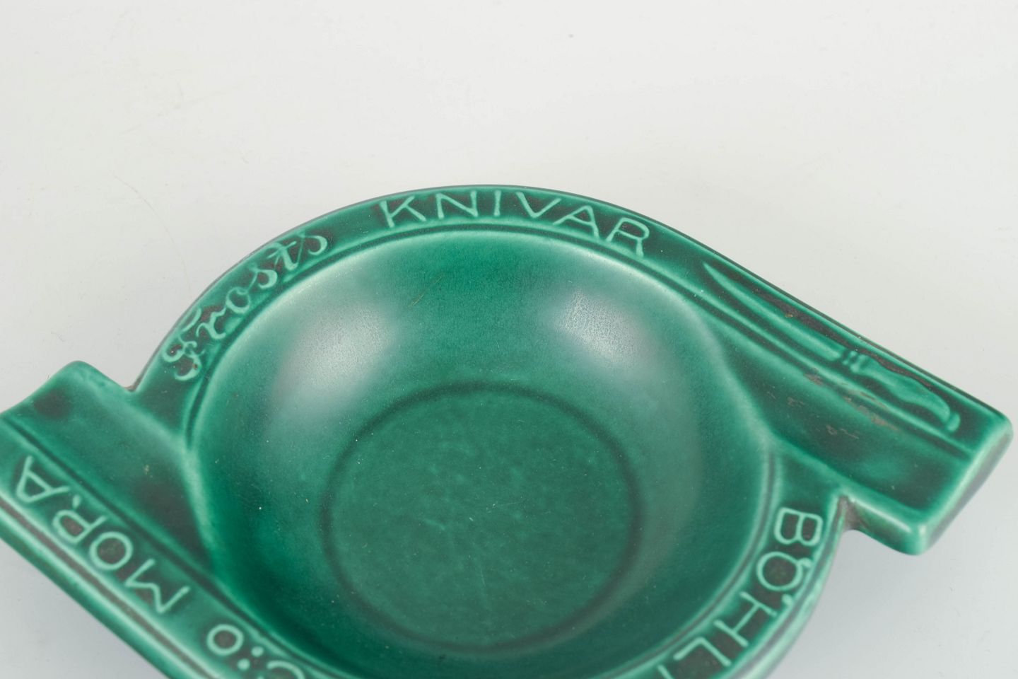 Keramisk reklame-askebæger med indpresset tekst BÖHLMARK & C:o, MORA, Frosts KNIVAR”. Klassisk Art Deco-form med grøn glasur og reliefdetaljer.