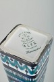 Håndmalet kegleformet vase i fajance med geometrisk dekoration i turkise, sorte og hvide nuancer. Et karakteristisk eksempel på svensk 1950/60’er design med tydelig modernistisk formsprog.