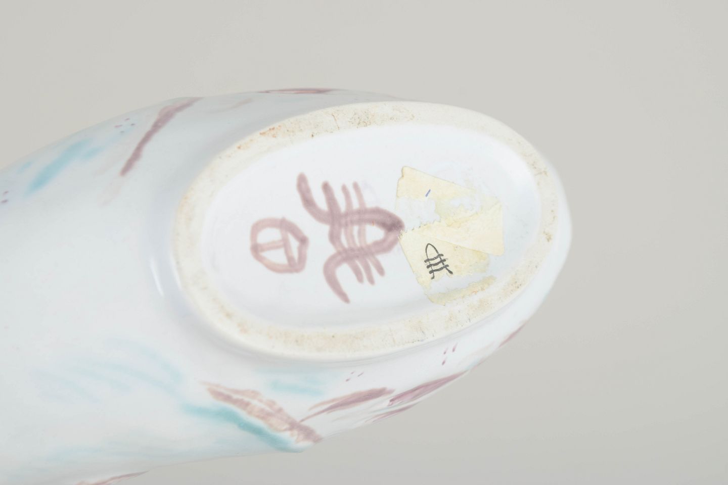 Figurativ sovseskål i form af en fugl, udført i fajance med håndmalet dekoration i lyseblå, rosa og gyldne toner. Et karakteristisk eksempel på Aluminia’s legende formsprog i midten af det 20. århundrede.