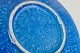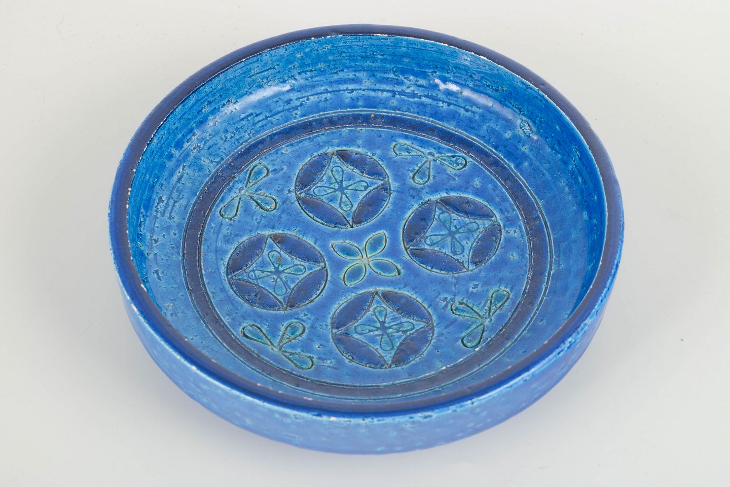 Dekorativ lav skål i keramik med reliefdekoration og karakteristisk “Rimini Blu”-glasur i klare blå og turkise nuancer. Et klassisk eksempel på Aldo Londis ikoniske design for Bitossi, hvor håndglaserede overflader og geometriske mønstre kombineres i en levende, skinnende farvepalet.