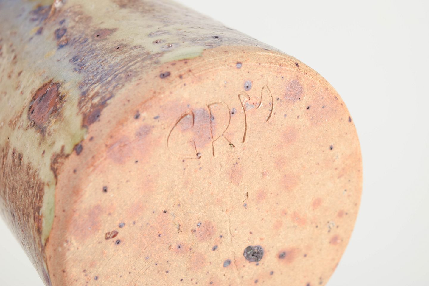 Unik hånddrejet kande i stentøj med rustik glasur i beige og brunlige nuancer, prikket overflade og markant hank. Signeret af kunstneren under bunden.