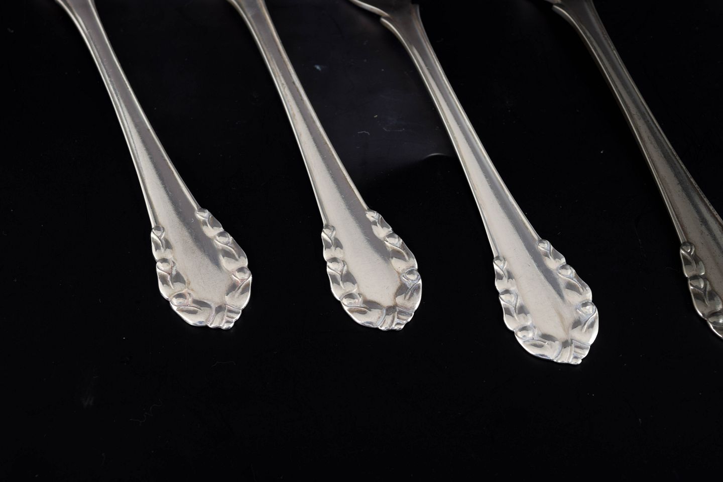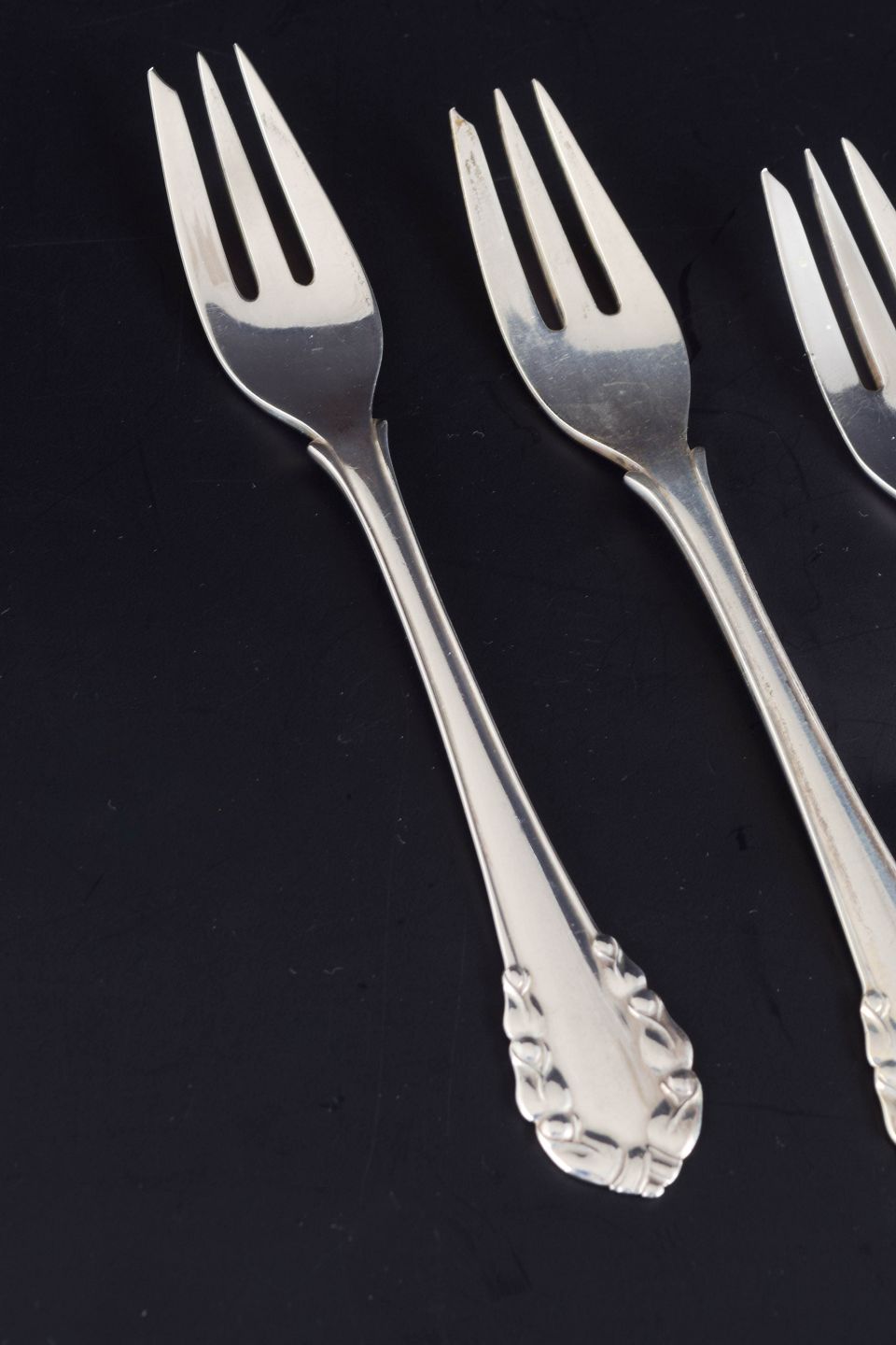 Sæt med fem kagegafler i sterlingsølv fra Georg Jensen i det klassiske “Liljekonval”-mønster. Elegant udført med afrundede linjer og blomsterornamentik i art deco-stil. Stemplet “GEORG JENSEN STERLING DENMARK”.