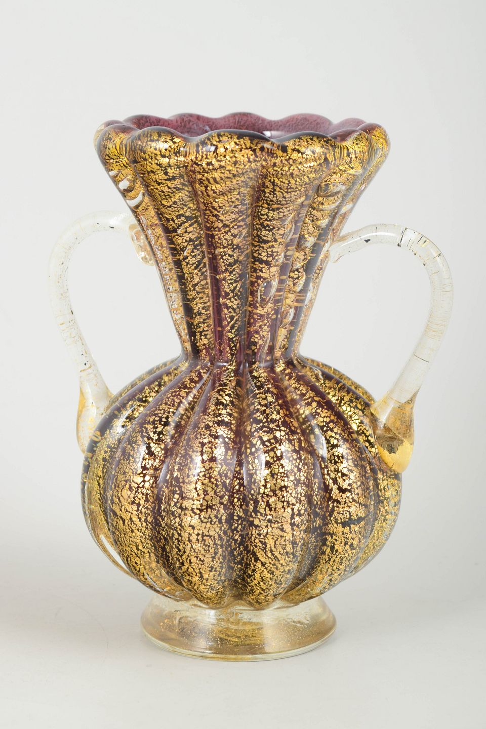 Dekorativ Murano-vase med riflede sider, to klare håndtag og indlagt guldstøv (aventurine). Farverig, skulpturel form med bølget kant.