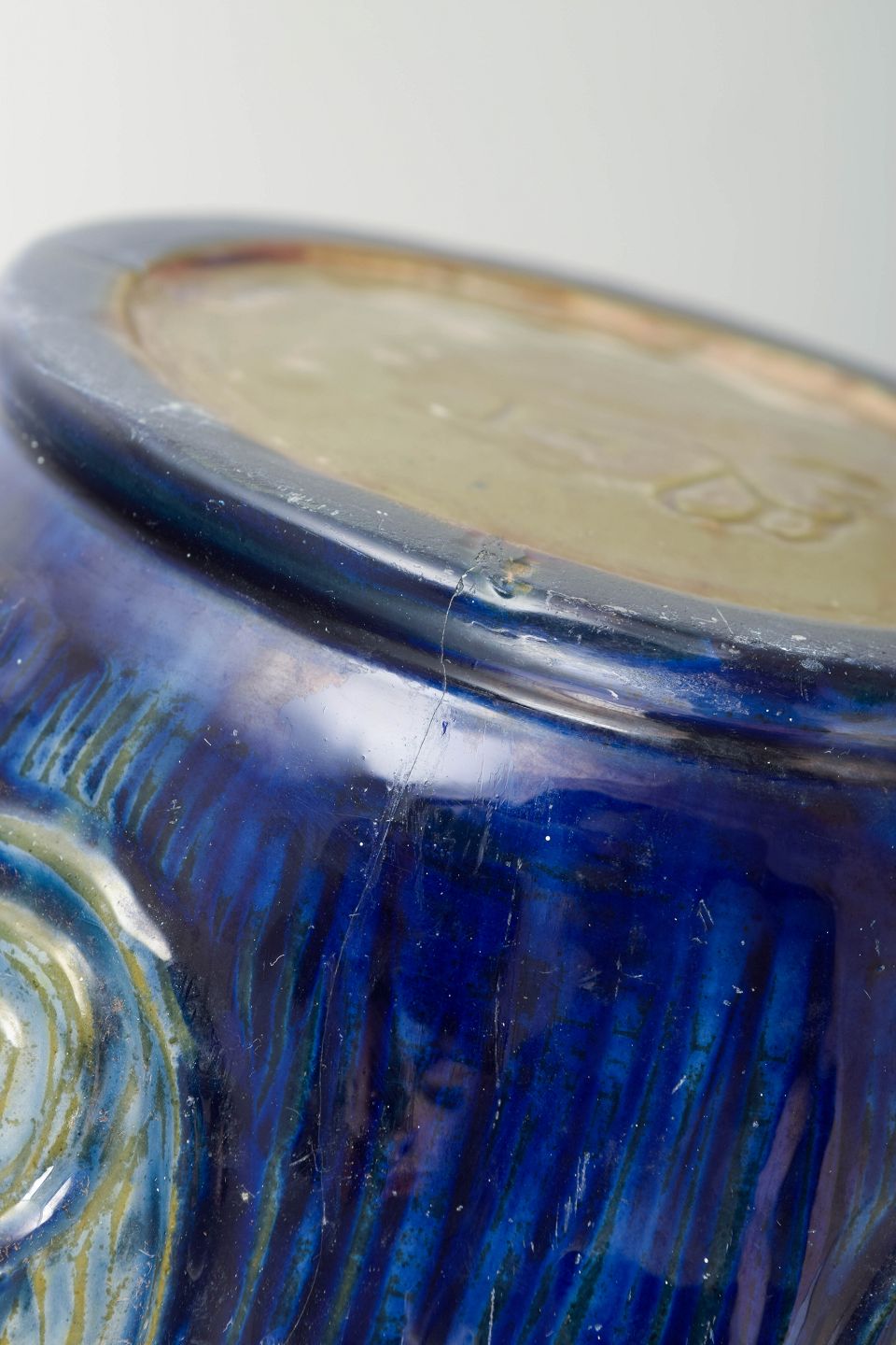 Håndlavet keramikvase i udpræget Art Nouveau-stil med organiske, reliefdekorerede linjer og dyb blå/grøn løbeglasur. Et tidligt dansk kunsthåndværkseksempel fra perioden omkring 1. verdenskrig.