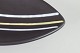 Keramisk skål i den ikoniske “Trio”-serie, dekoreret med grafiske linjer i hvid og gul på mørk baggrund. Elegant, aflang form, typisk for Oldfors’ modernistiske formsprog.